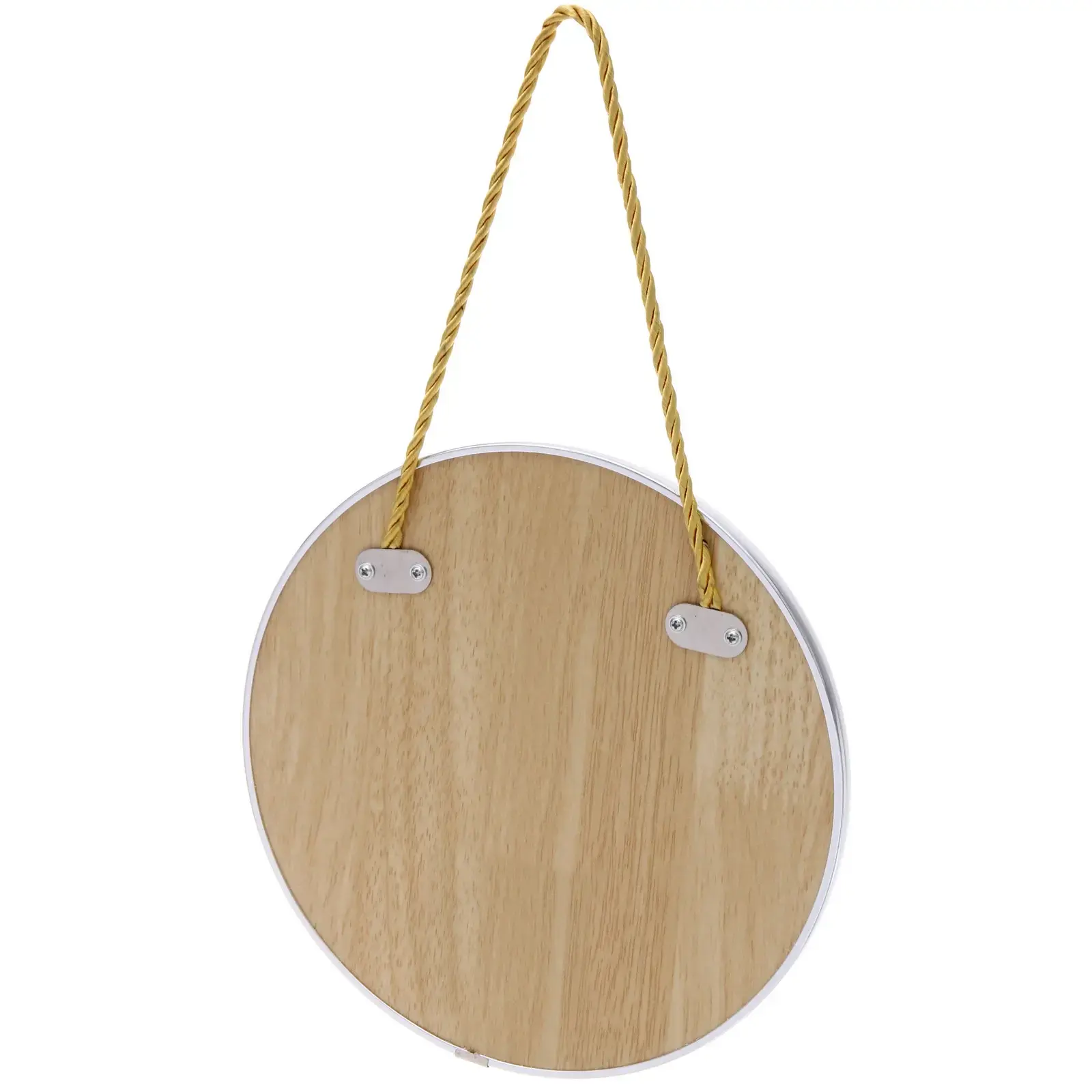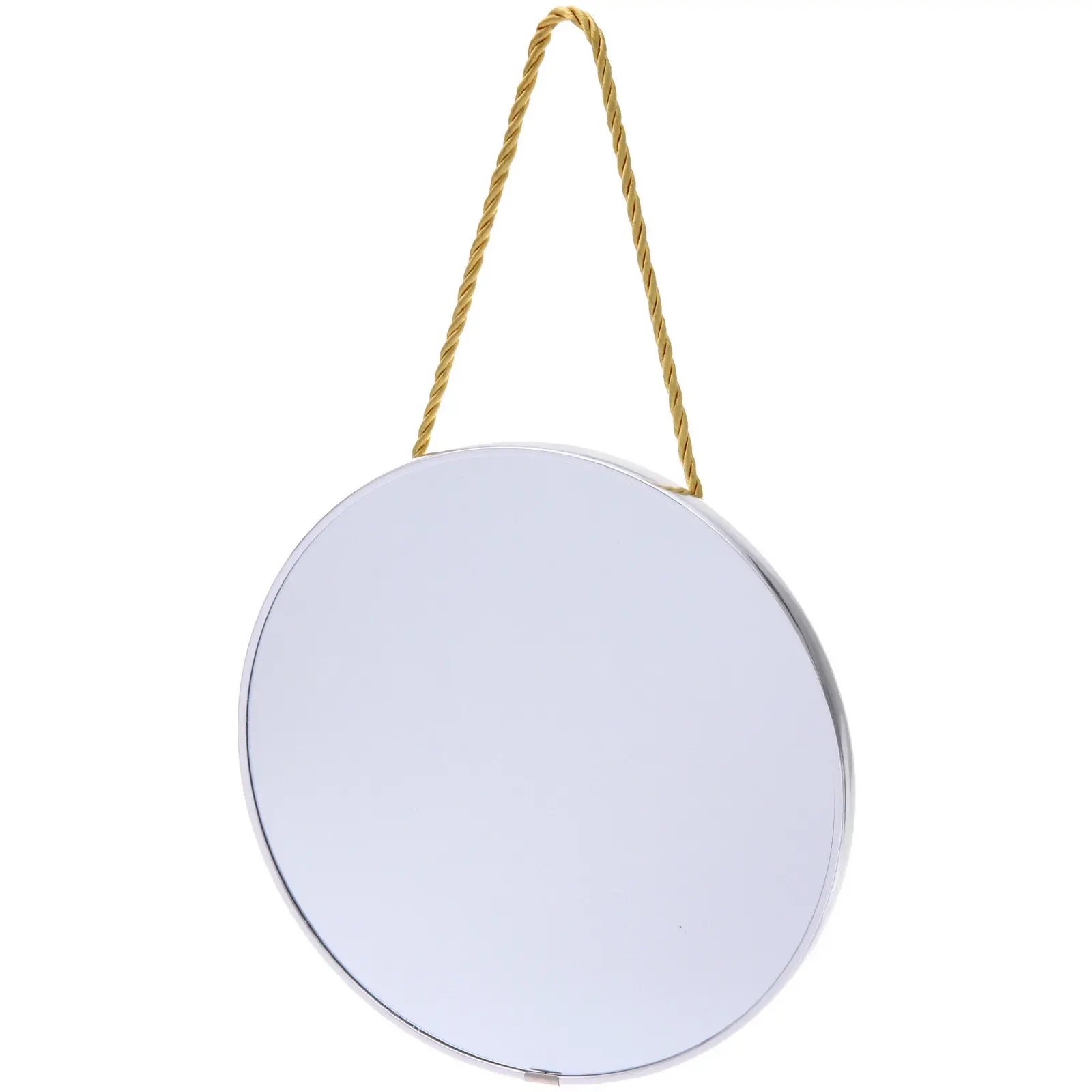 Зеркальная поверхность изготовлена из глянцевого стекла, обрамление – хромированный металл. Диаметр изделия составляет 21 см, оптимально для большинства бытовых целей. Витой жёлтый шнур обеспечивает надёжную подвеску, подходит для размещения как на гвозде, так и на крючке.