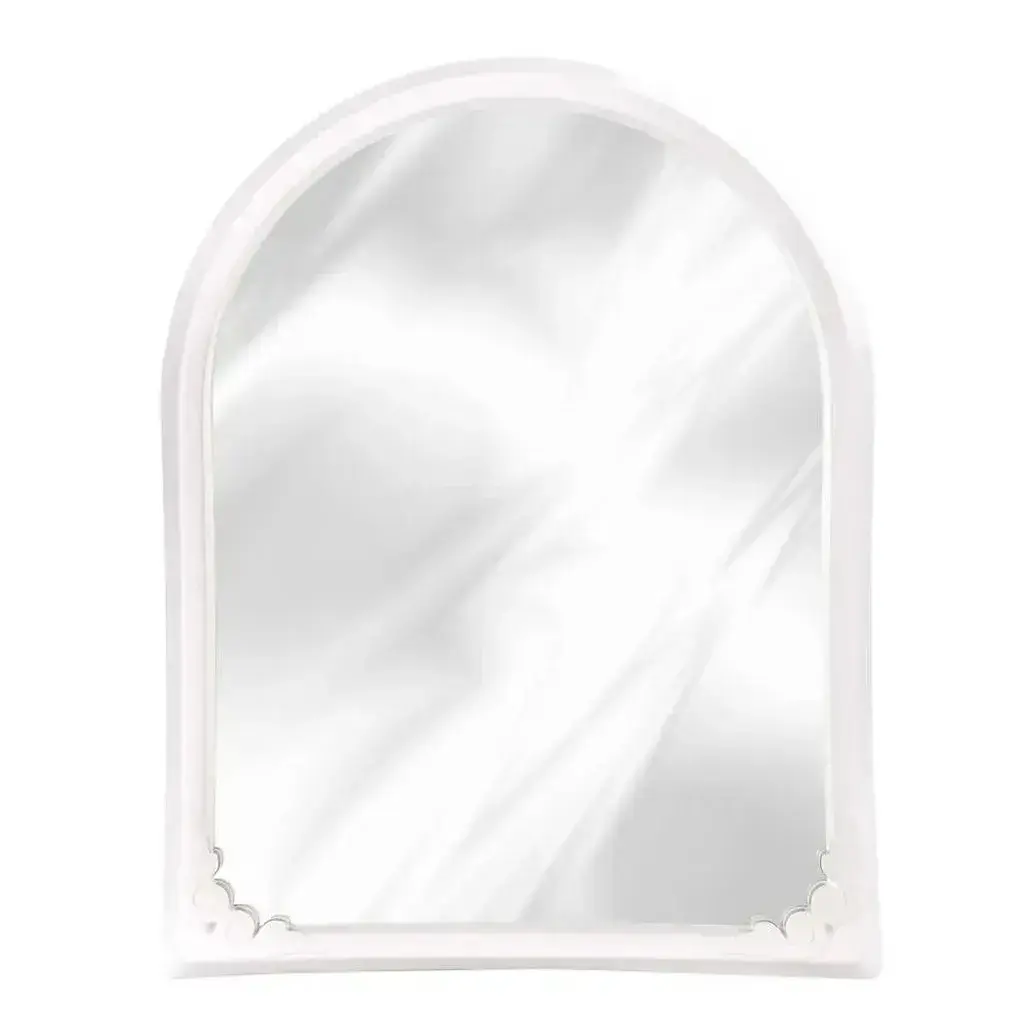 Арочное зеркало с декоративной белой рамкой станет изысканным акцентом в ванной комнате или прихожей. Волнистый узор в нижней части создаёт эффект лёгкости и визуально увеличивает пространство.