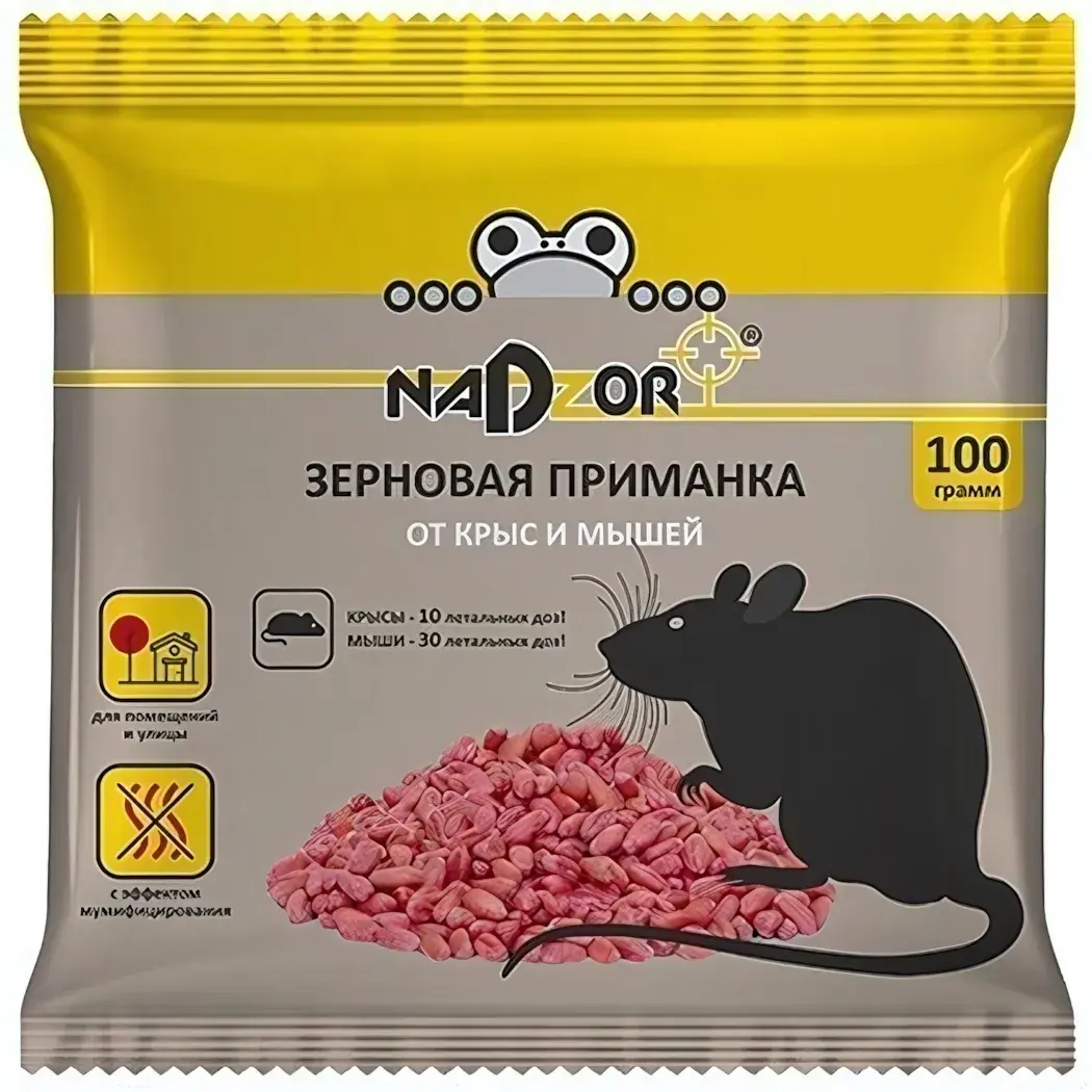 Забудьте о проблемах с грызунами! Зерновая приманка от мышей и крыс 100г «Nadzor» — это надежное решение для вашего дома и дачи. Приманка, основанная на пшенице и кукурузе, обладает высокой привлекательностью для грызунов, что обеспечивает быстрое и эффективное уничтожение. Благодаря активному веществу последнего поколения, вы сможете избавиться от мышей и крыс всего за 3-7 дней после первого поедания приманки.