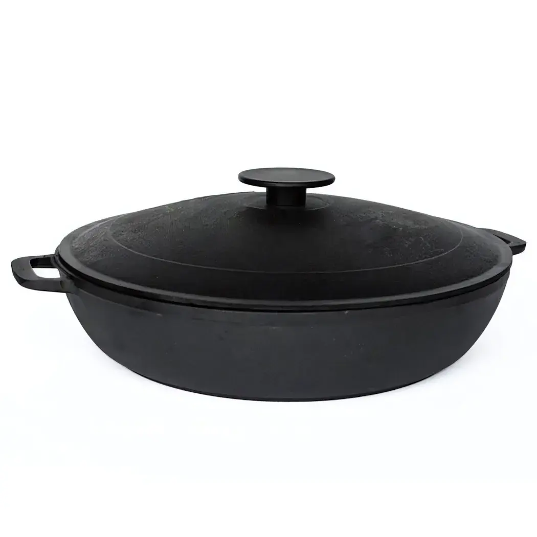 Размер жаровни составляет 30 см в диаметре, что делает ее идеальной для приготовления порций на 2-4 человека. Изготовленная из чугуна, она обладает высокой прочностью и долговечностью. Крышка с центральной ручкой обеспечивает удобство при открывании и закрывании, а две боковые ручки позволяют легко маневрировать с жаровней. Не упустите возможность сделать вашу кухню более функциональной и стильной с жаровней от Гардарика!