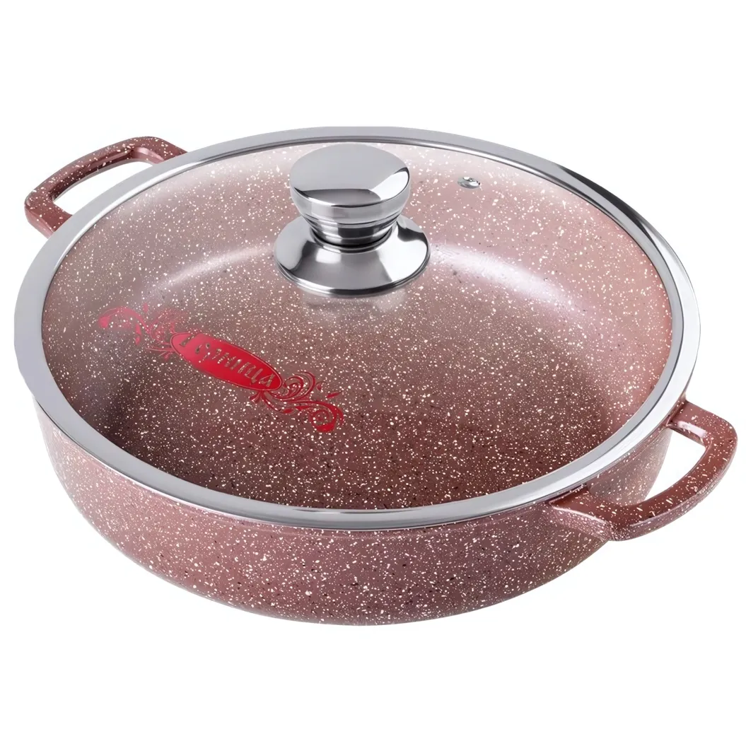 Эта литая алюминиевая жаровня с эффектным дизайном «под камень» станет незаменимой на вашей кухне. Она сочетает в себе высокую функциональность, равномерный нагрев и стильный внешний вид, который украсит любой стол. Благодаря прозрачной стеклянной крышке вы сможете контролировать процесс приготовления, не выпуская пар и ароматы.