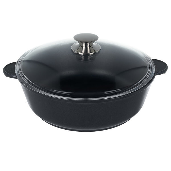 Жаровня идеально подходит для ежедневного использования. Она выполнена из литого алюминия, что обеспечивает равномерное распределение тепла и предотвращает пригорание пищи. Стеклянная крышка позволяет следить за процессом приготовления, не открывая посуду, что сохраняет тепло и ароматы. Подходит для всех типов плит, включая индукционные.