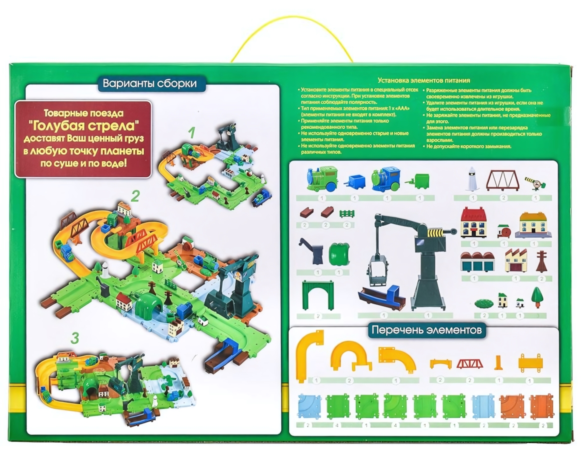 Железная дорога «Голубая стрела»: товарная станция с краном, 2 поезда, 3 варианта сборки