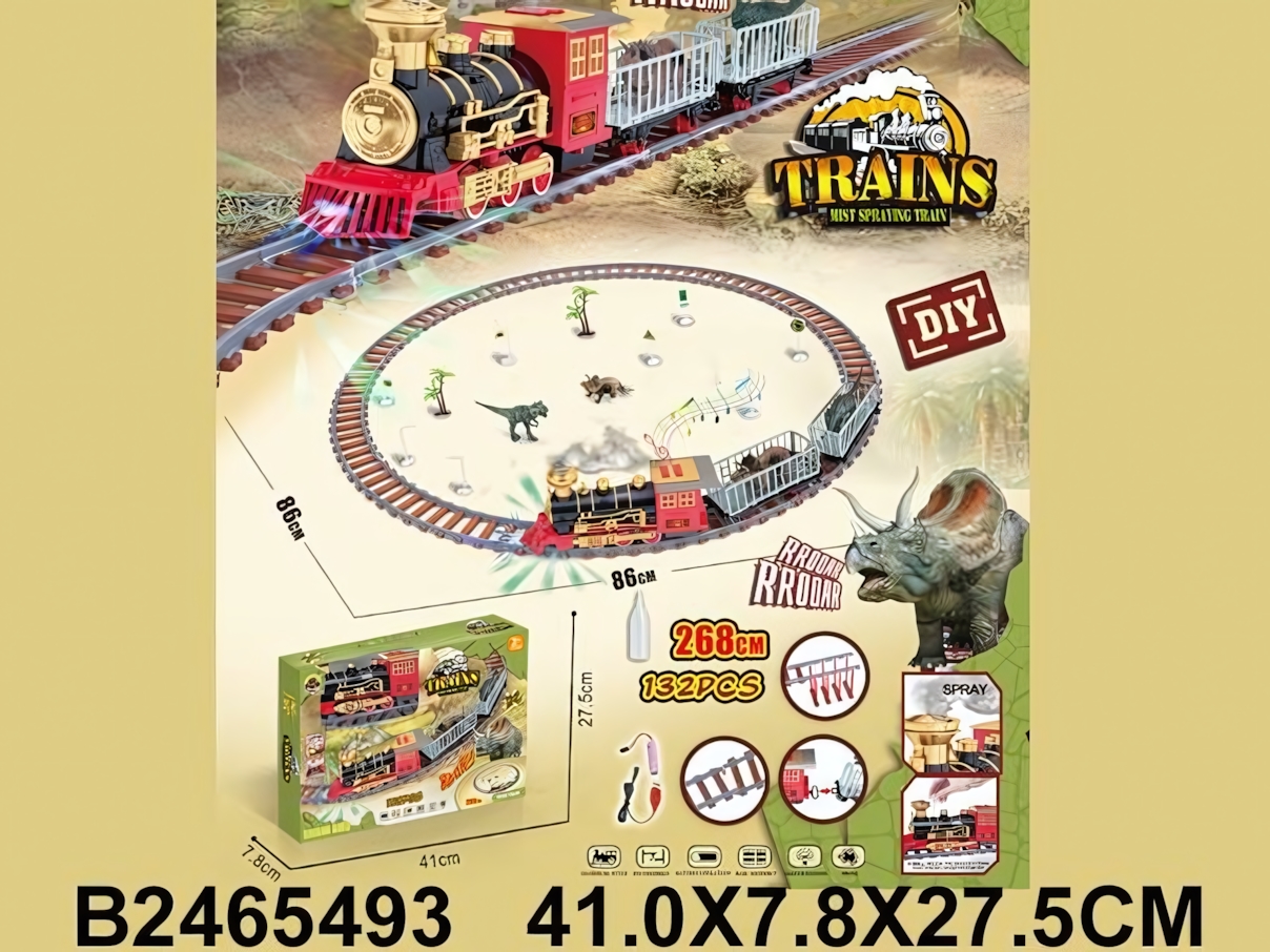 Набор включает 132 детали, из которых собирается овальная трасса длиной 268 см. Внутри можно разместить фигурки и декорации, создавая собственный доисторический мир. Управление поездом и наблюдение за движением поезда помогают развивать координацию, внимание и сюжетное мышление. Игрушка подходит для детей от 2 лет.