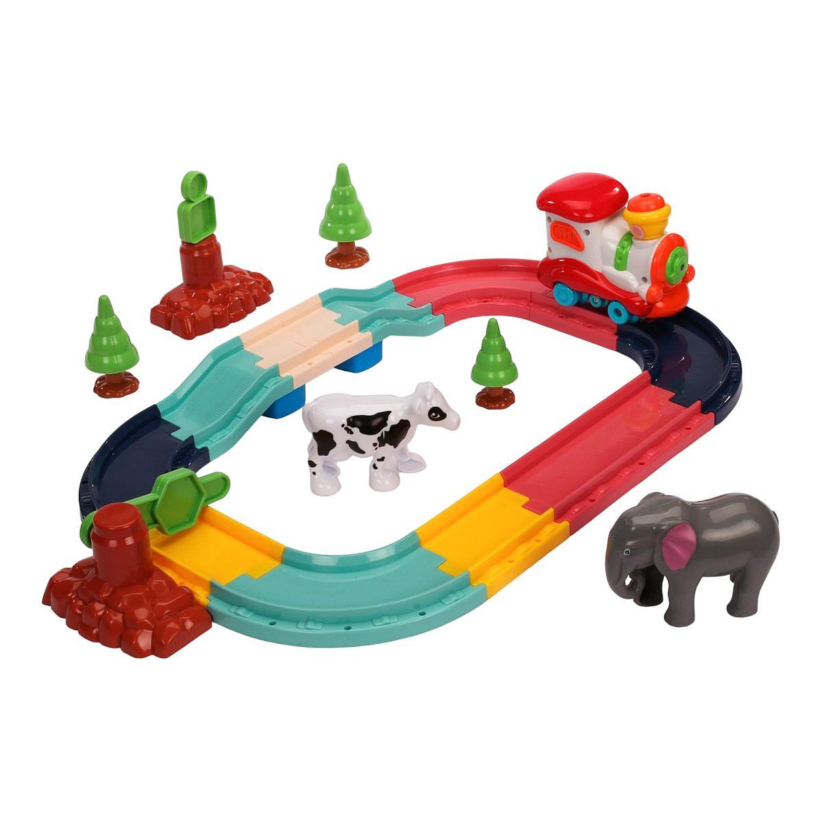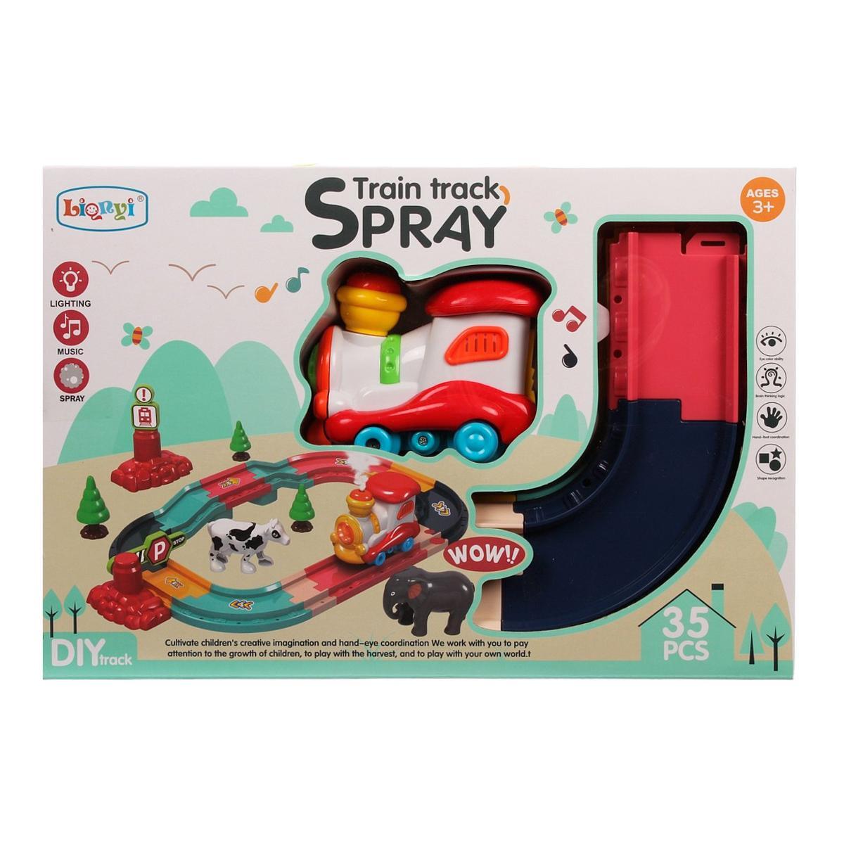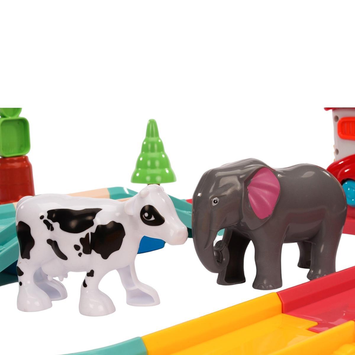 Набор включает в себя 35 деталей, среди которых пластиковые рельсы, паровозик и элементы окружения, такие как фигурки животных и деревья. Рельсы имеют модульную конструкцию, что позволяет создавать различные маршруты и изменять их форму. Это делает игру еще более увлекательной и разнообразной.