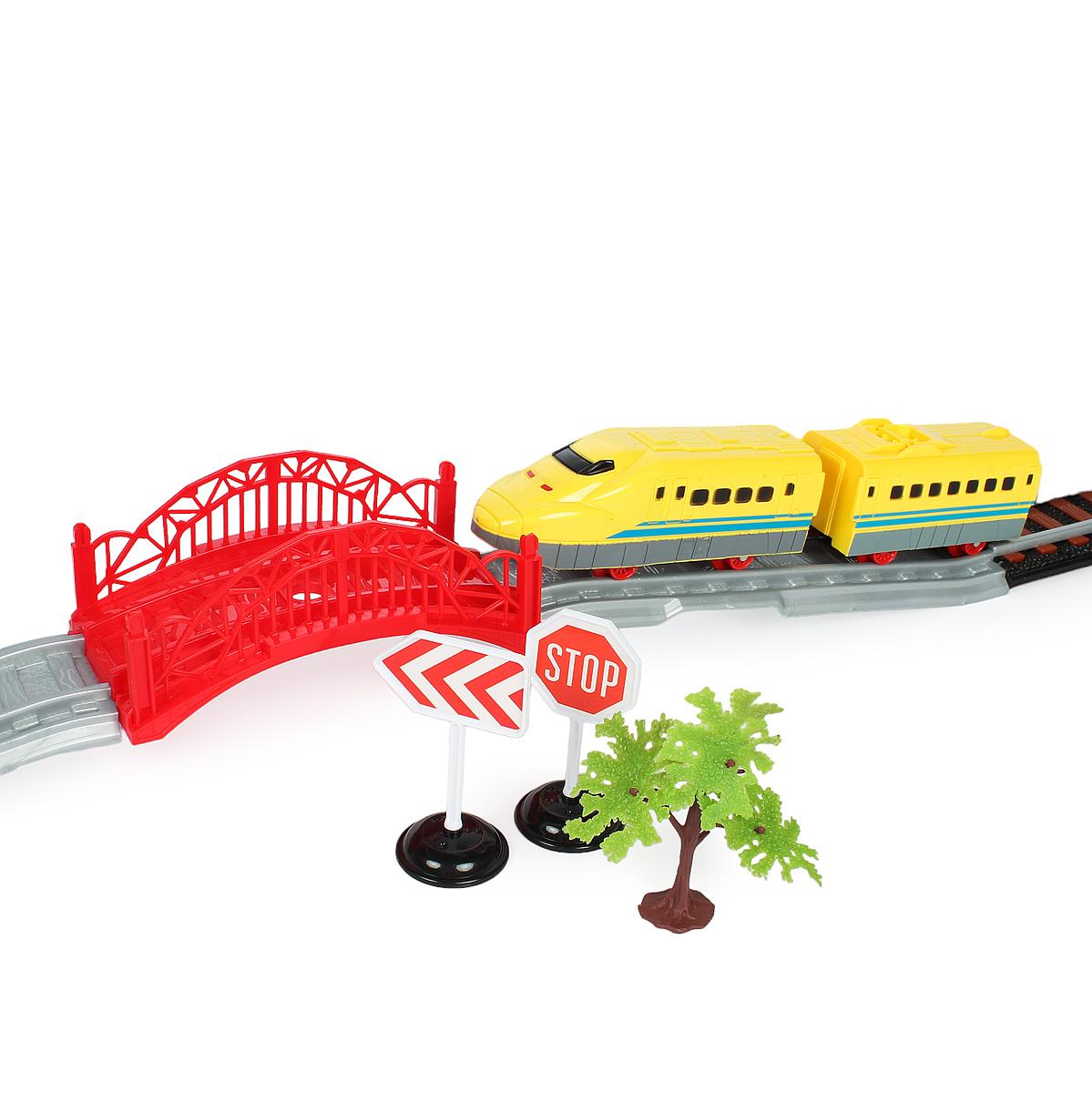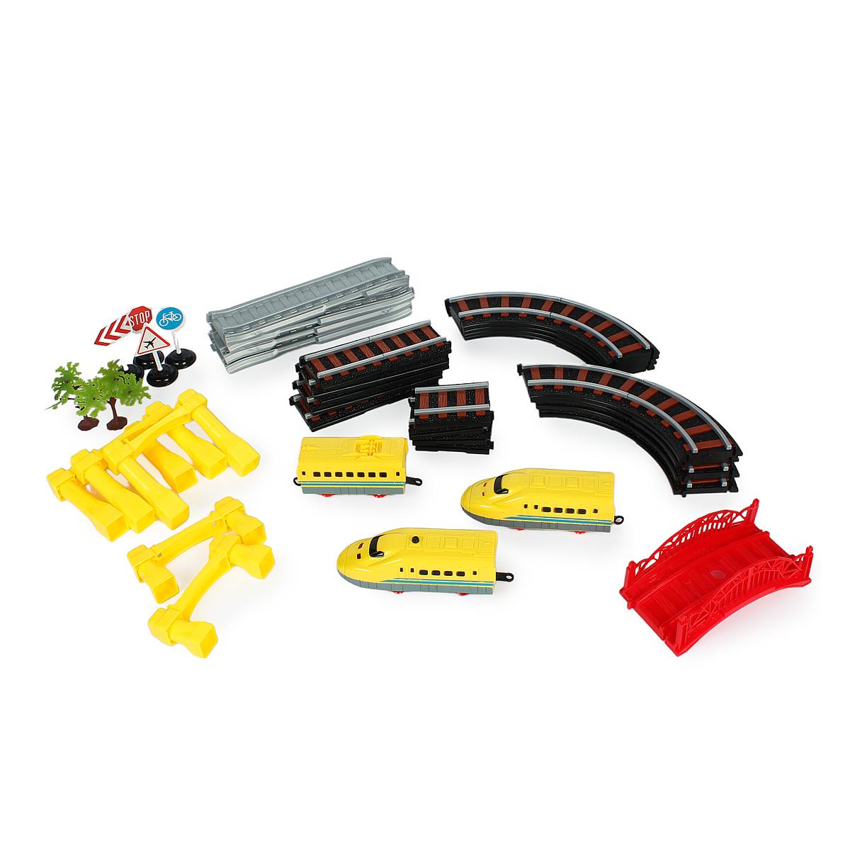 В комплект входит все необходимое для увлекательной игры: локомотив, вагоны, рельсы, мост, дорожные знаки и другие аксессуары. Соберите свой собственный железнодорожный мир и отправляйтесь в захватывающее путешествие!