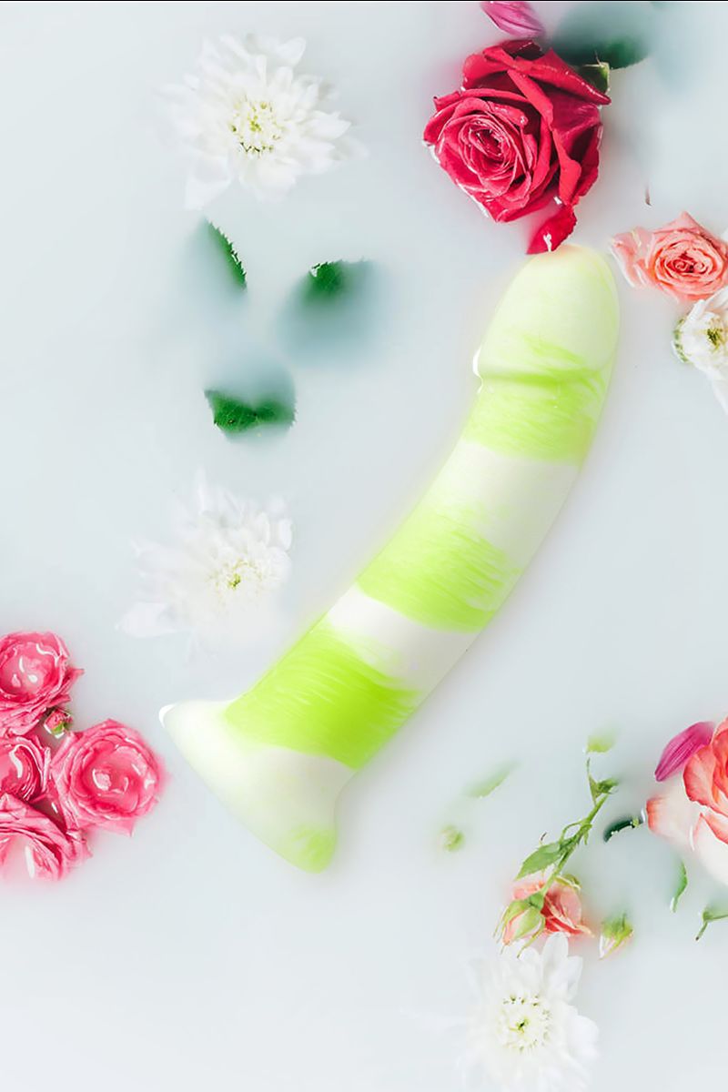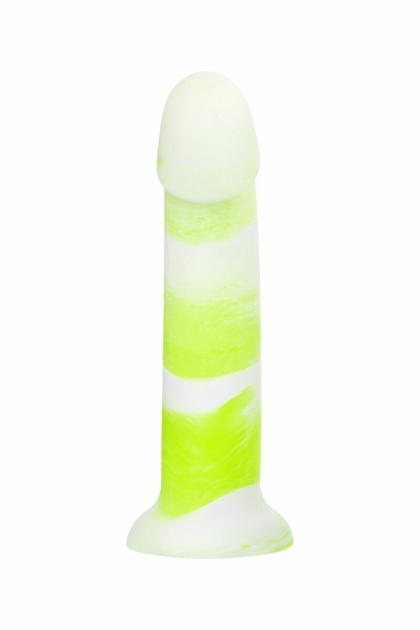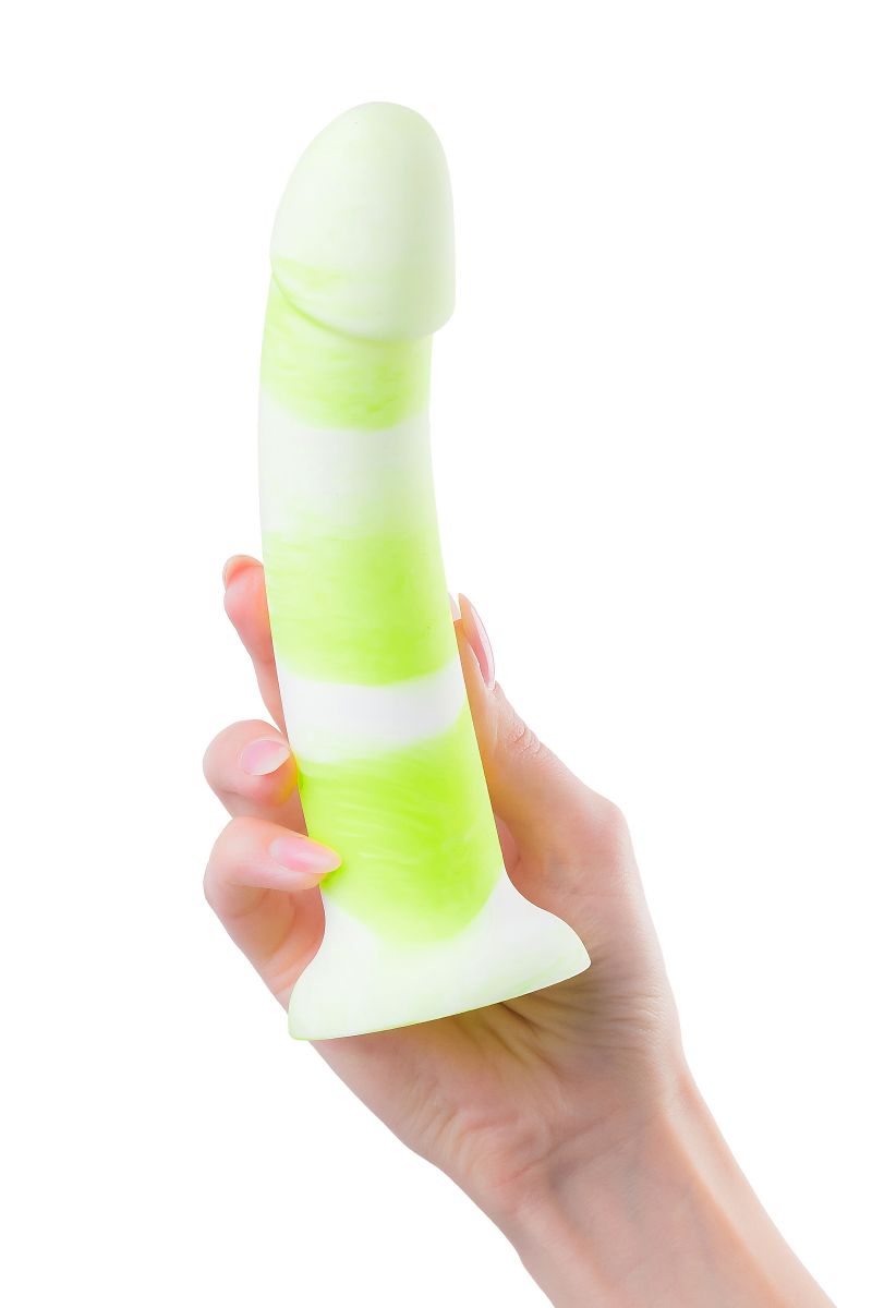 Матовый силикон не имеет резкого запаха и отличается эластичностью, что делает использование комфортным даже при длительных сессиях. Изогнутая форма способствует дополнительной стимуляции, а яркий желтый оттенок с оригинальными разводами добавляет эстетики и настроения. Модель не оснащена вибрацией, что позволяет полностью контролировать ритм и интенсивность самостоятельно.
