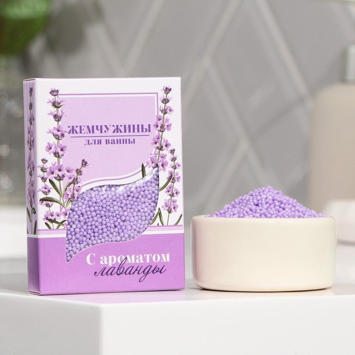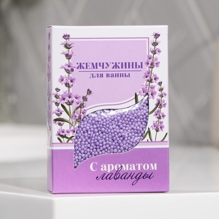 Объем упаковки составляет 100 г, что позволяет использовать продукт несколько раз. Упаковка выполнена в стильном светло-фиолетовом цвете с изображением лаванды, что делает её не только функциональной, но и эстетически привлекательной. Жемчужины имеют мелкую круглую форму и блестящую поверхность, что добавляет им привлекательности.