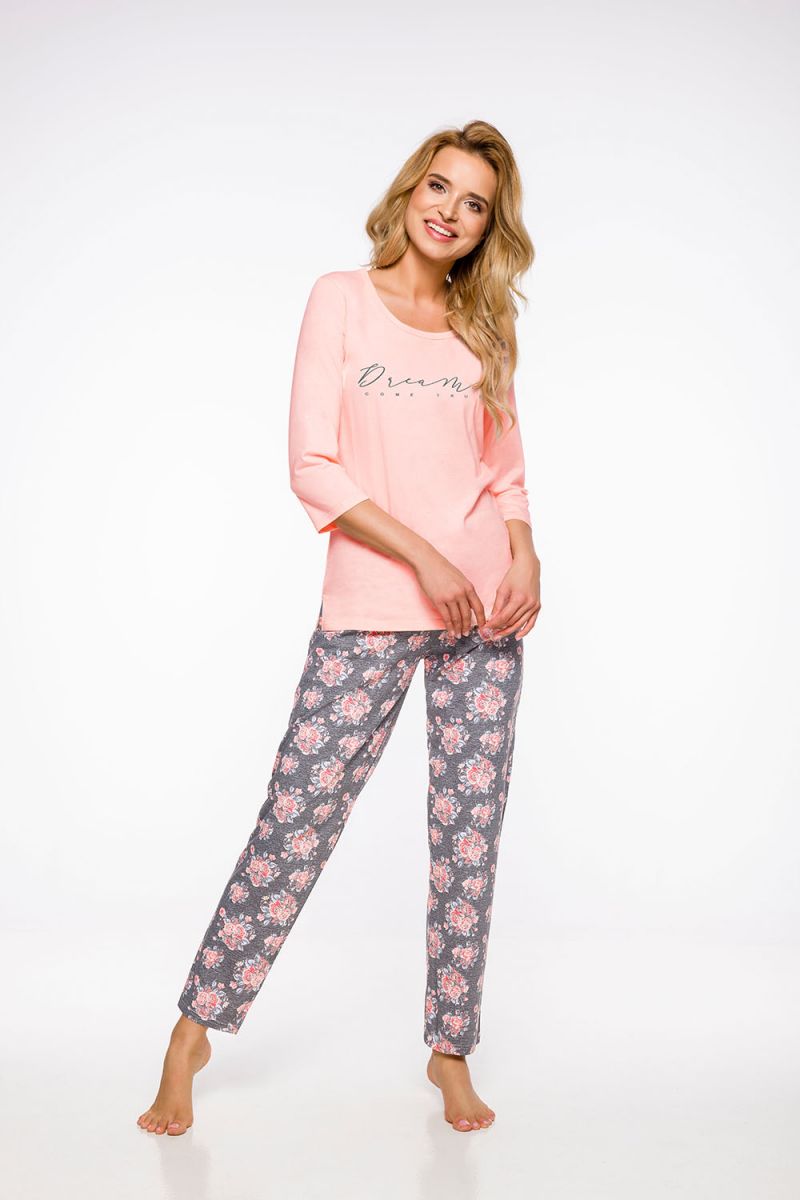 Пижама "Irma" создана для тех, кто ценит натуральные ткани и удобство. Комплект из мягкого лонгслива и свободных брюк подарит ощущение легкости и уюта после напряженного дня. Приятный серый цвет с персиковыми акцентами и нежным цветочным принтом добавит женственности вашему домашнему образу.