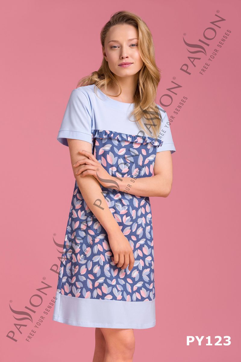 Сорочка представлена в спокойной двухцветной гамме: верхняя часть и рукава выполнены в светло-голубом оттенке, а основная часть — в синем цвете с нежным голубым и розовым листовым принтом. Низ изделия аккуратно отделан контрастной светло-голубой полосой, что добавляет образу завершенности. Модель соответствует размеру XL.