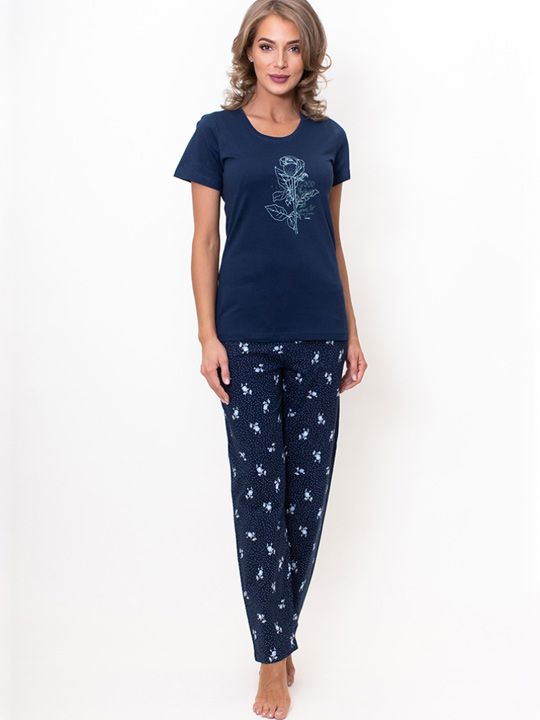 - Брюки прямого кроя – свободный силуэт, не сковывающий движений, по всей поверхности ткани – мелкий цветочный рисунок, гармонирующий с принтом на футболке.