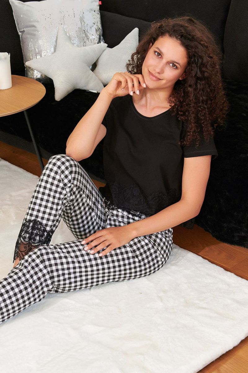 Комплект состоит из укороченного топа с короткими рукавами и модных клетчатых брюк. Топ украшен нежным кружевом, что добавляет образу женственности и изящества. Брюки на широкой мягкой резинке не сдавливают талию, а зауженный к низу крой делает силуэт аккуратным и современным.