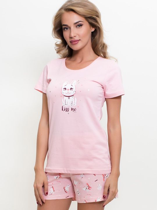 Мягкий трикотажный комплект из футболки и шорт станет вашим любимым вариантом для домашнего отдыха. Пижама выполнена из 100% хлопка, который обеспечивает приятные тактильные ощущения и позволяет коже дышать. Нежно-розовый цвет создаёт умиротворяющую атмосферу, а милый принт с кошечкой добавляет образу игривости и очарования.
