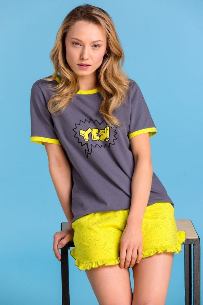 Пижама состоит из двух предметов: футболки с коротким рукавом и круглым вырезом горловины, а также коротких шорт. Футболка выполнена в сером цвете с жёлтыми акцентами по горловине и рукавам. Шорты имеют ярко-жёлтый оттенок с мелким крапом и украшены волнистым рюшем по нижнему краю. Длина шорт открывает верхнюю часть бёдер, создавая лёгкий и летний образ.