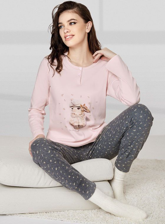 Размер: S. Цвет: розовый с серым. Материал: хлопок. Пижама доступна в нескольких вариантах дизайна, но именно этот вариант с зайцем станет настоящим акцентом вашего домашнего образа. Не упустите возможность добавить в свой гардероб эту стильную и удобную пижаму!