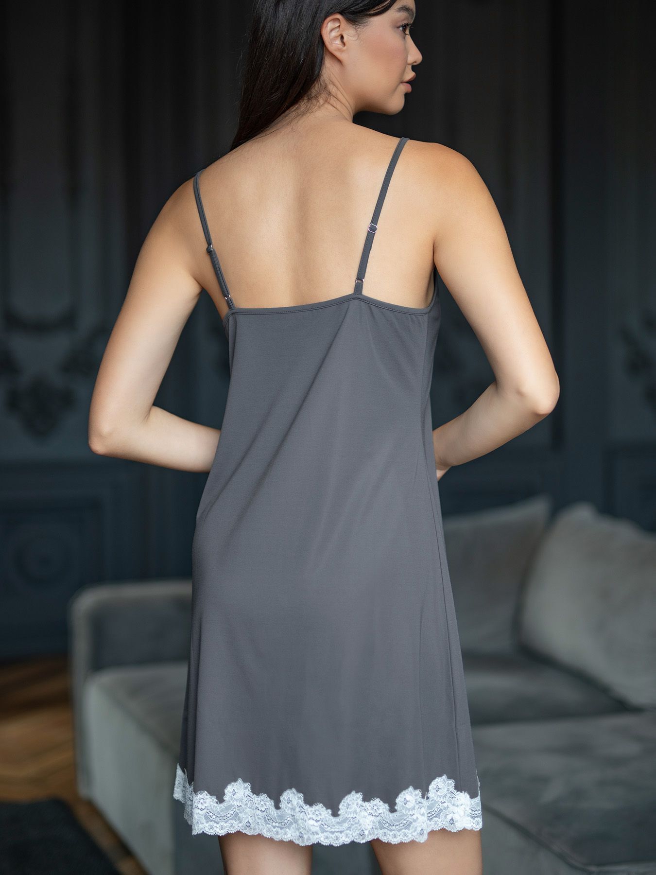 Сорочка выполнена в благородном сером цвете с контрастной отделкой. Состав: 45% вискоза (мягкость и воздухопроницаемость), 35% нейлон (долговечность), 10% спандекс (эластичность), 10% тенсел (шелковистая текстура). Рекомендуется для размера L: обхват груди 93-96 см, талии 73-77 см, бедер 101-105 см.