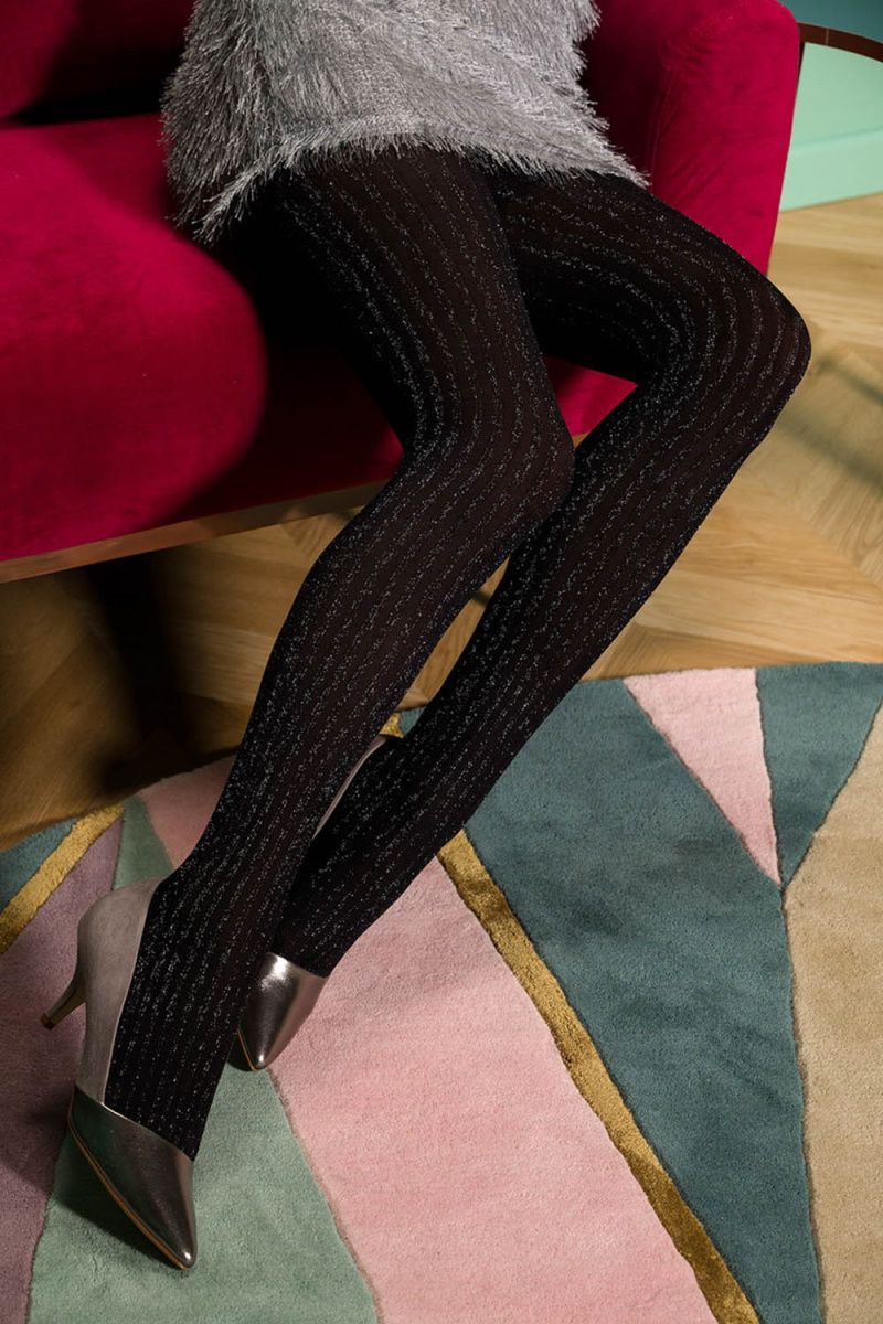 Классический черный цвет в сочетании с серебристым блеском люрекса делает эти колготки универсальным аксессуаром. Они гармонично дополнят как строгий деловой образ с юбкой-карандашом, так и более смелый вечерний лук с коротким платьем. Вертикальный узор с блестящими нитями визуально вытягивает силуэт, делая ноги более стройными.