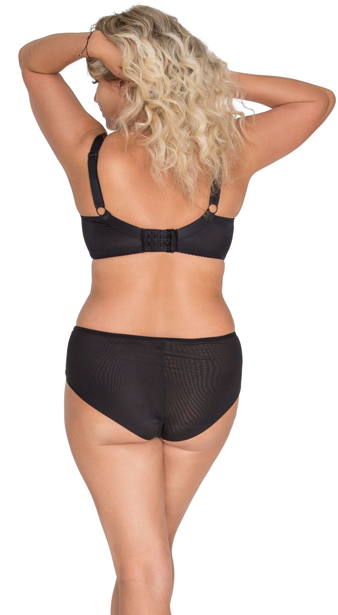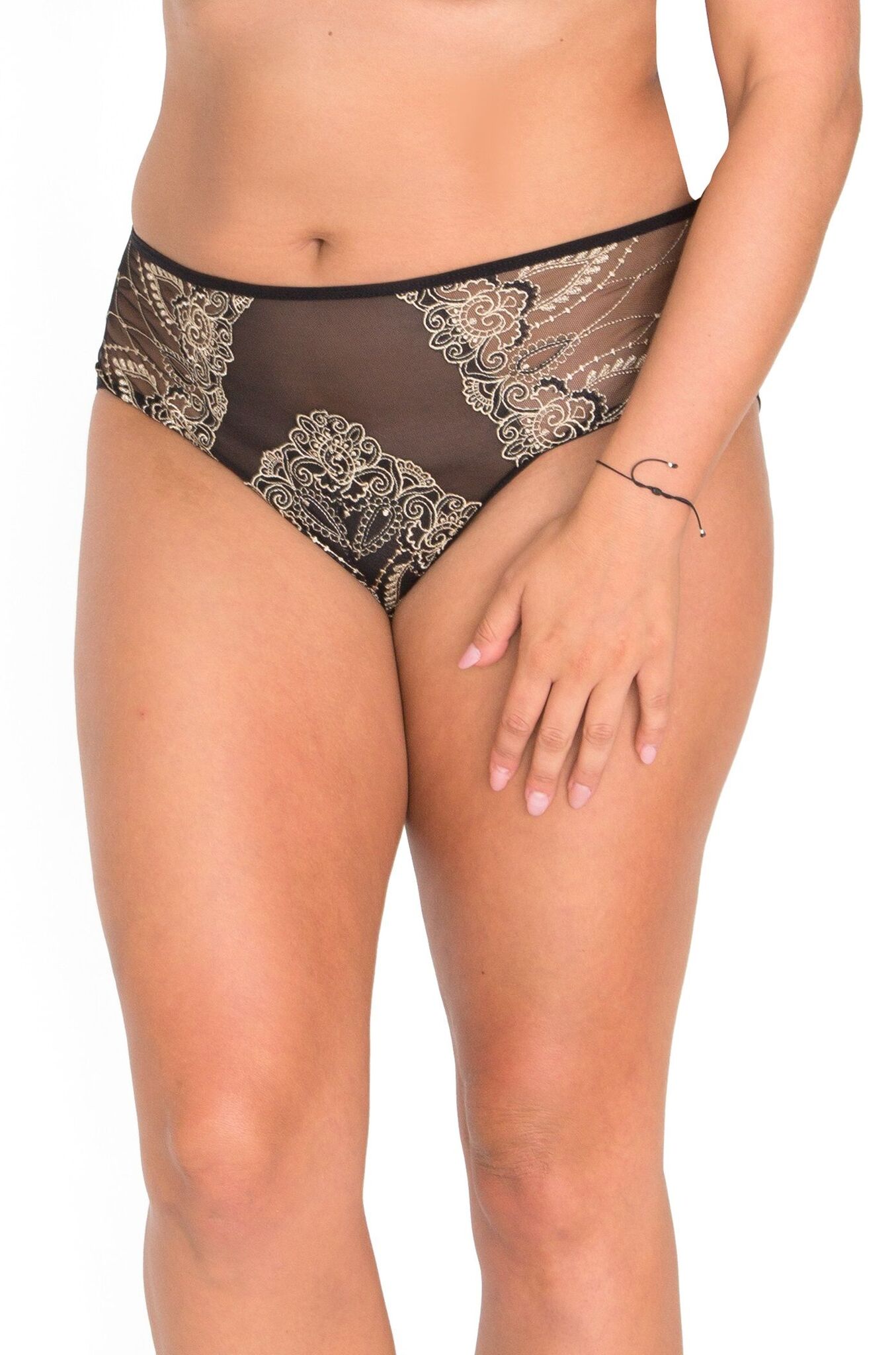 Трусики имеют классическую форму с высокой посадкой, которая обеспечивает комфортную поддержку и не стесняет движений. Полупрозрачная сетка создает игривый эффект, а золотистые элементы вышивки добавляют нотку роскоши.