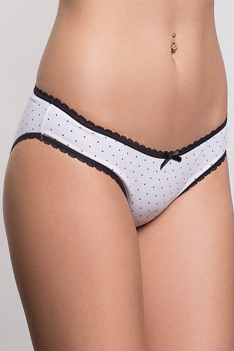 Эти изящные трусики-слипы сочетают в себе повседневный комфорт и деликатную женственность. Модель выполнена в классическом белом цвете с очаровательным мелким черным горошком, который создает игривый и стильный акцент. Черная кружевная окантовка по всем срезам и миниатюрный декоративный бантик спереди добавляют образу изысканности и романтичности, делая простое нижнее белье по-настоящему особенным.