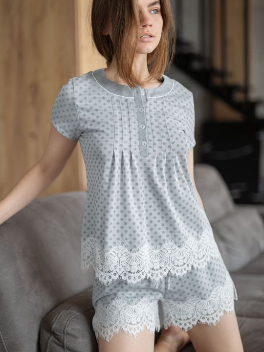 Представляем вам женский домашний комплект, который сочетает в себе комфорт и элегантность. Этот комплект идеально подходит для уютных вечеров дома, когда вы хотите чувствовать себя расслабленно и стильно. Мягкий трикотаж с рисунком «горошек» добавляет изюминку, а кружевные детали придают комплекту романтичный вид.