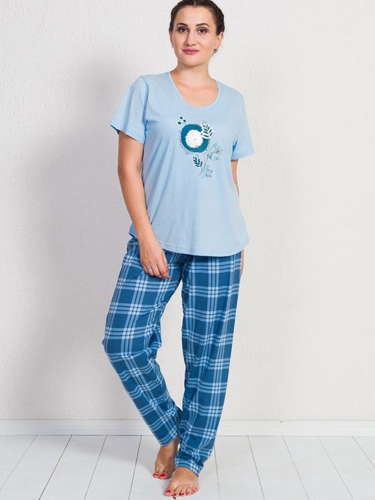 Женский комплект с брюками в крупную клетку создан для тех, кто ценит удобство и аккуратный внешний вид даже дома. Свободный крой и мягкое сочетание футболки с коротким рукавом и брюк делают образ легким и расслабленным, а голубая цветовая гамма добавляет свежести и спокойствия.