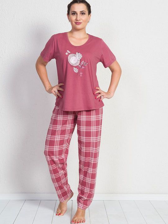Футболка с круглым вырезом аккуратно садится по фигуре и не сковывает движений. Брюки прямого кроя в крупную клетку гармонично сочетаются с однотонным верхом, создавая стильный домашний образ. Комплект подходит для сна, отдыха после рабочего дня, утреннего кофе или неспешных выходных дома.