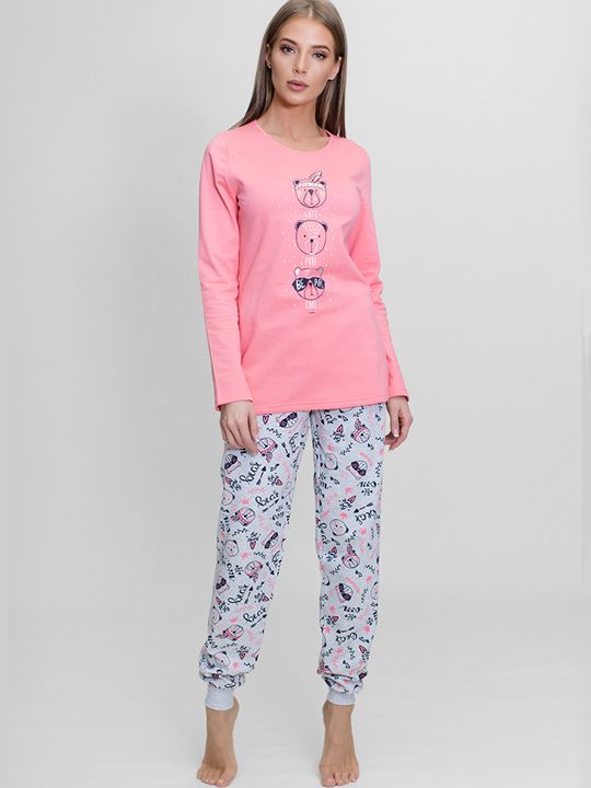 Женский трикотажный комплект "Мишки" с длинным рукавом, розовый с серым, размер S, 100% хлопок