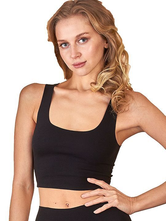 Топ изготовлен из высококачественного материала (95% хлопок, 5% эластан), что гарантирует мягкость, воздухопроницаемость и эластичность. Широкие бретели и круглый вырез обеспечивают удобную посадку и поддерживают фигуру без стеснения движений.