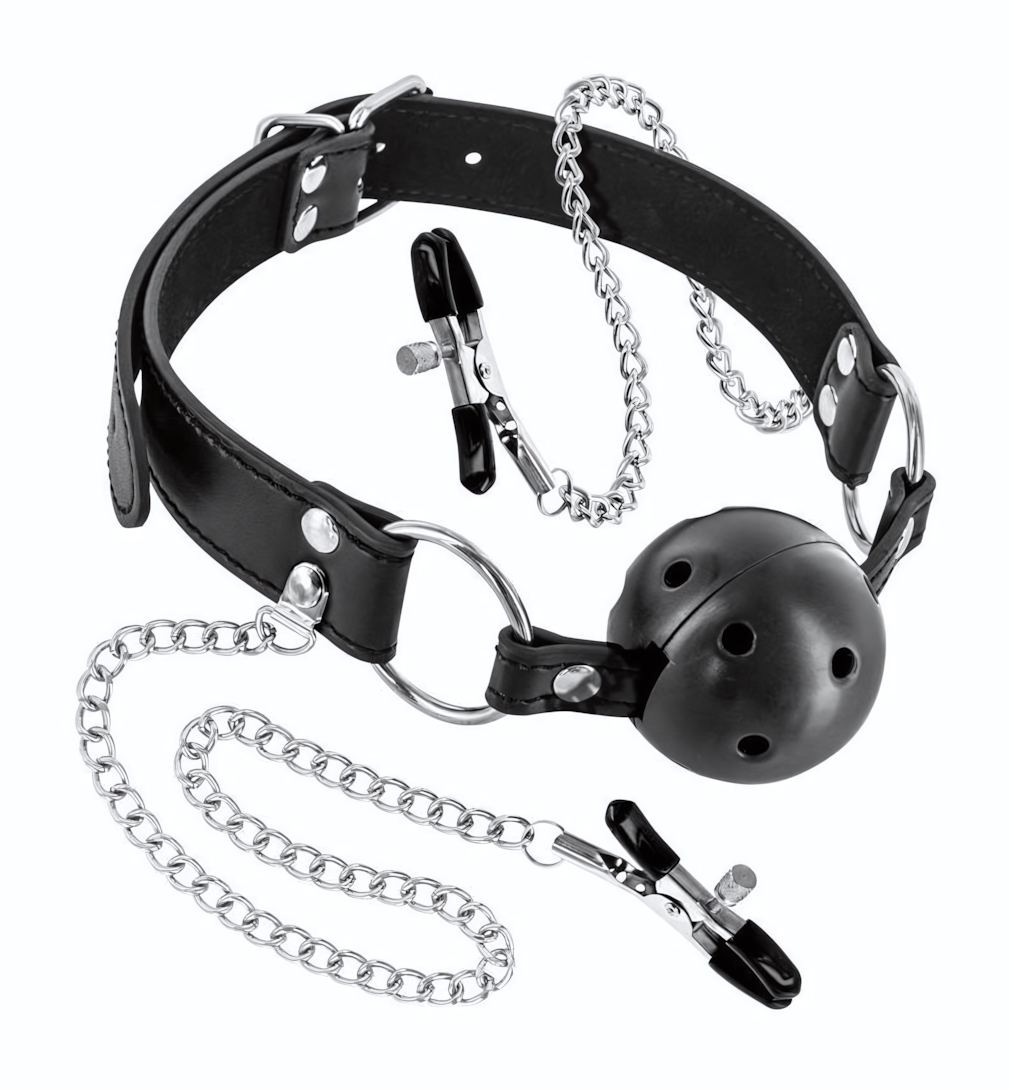 Кляп-шар с зажимами для сосков, черный, диаметр 4см, пластик/нейлон