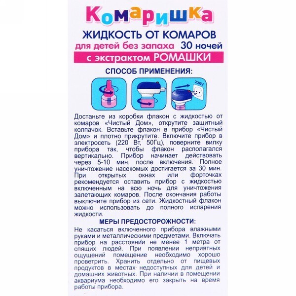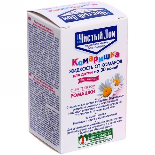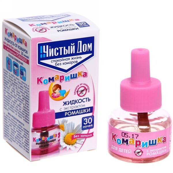 Представляем жидкость от комаров 'Чистый дом', специально разработанную для защиты ваших детей в ночное время. Благодаря натуральному составу с экстрактом ромашки, средство эффективно отпугивает насекомых, не вызывая раздражения и аллергии.