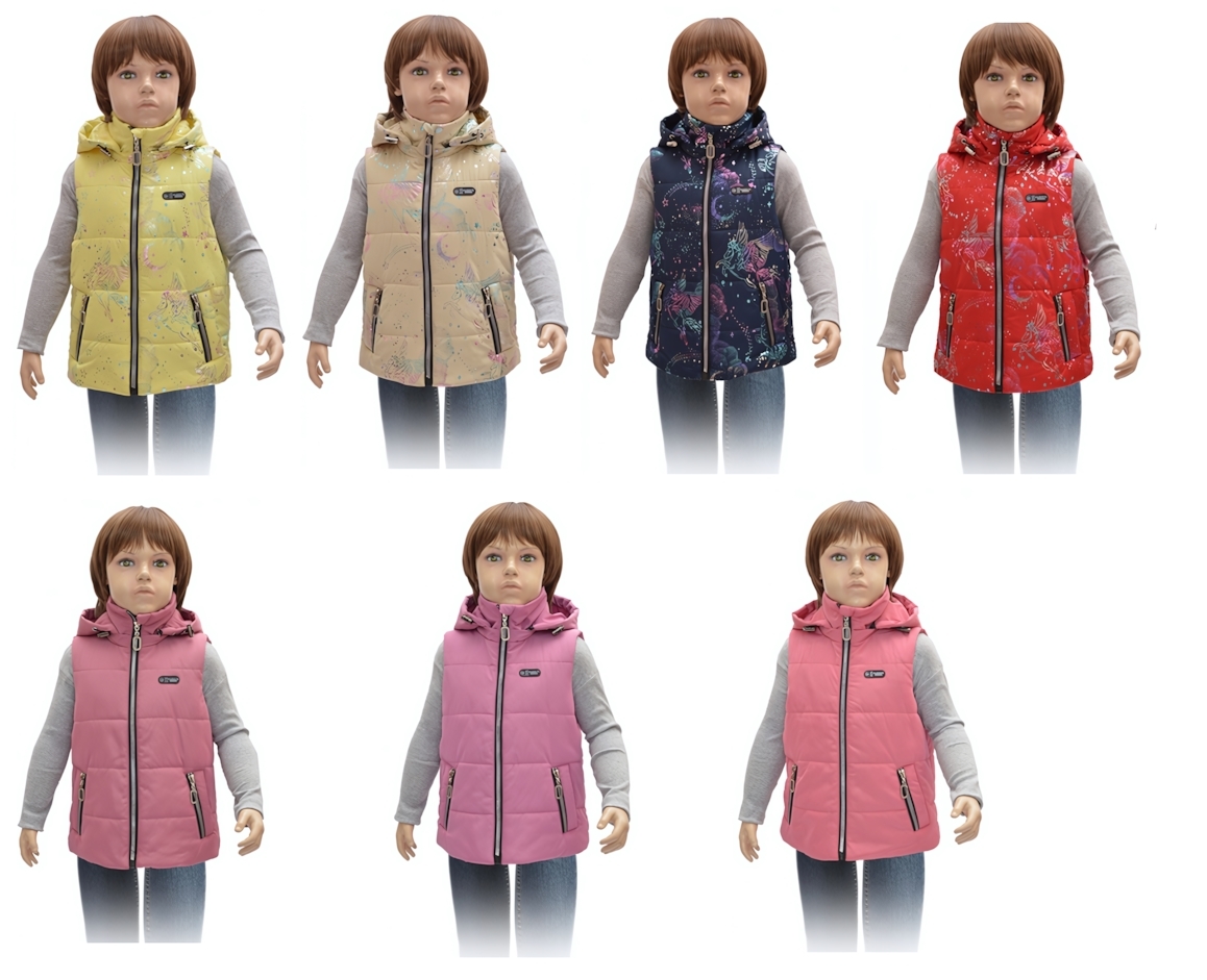 Жилет детский утепленный с капюшоном, размер 128, дьюспа, утеплитель «Теплофил» 150 г/м², разноцветный принт