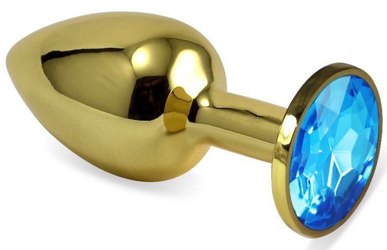 Основная часть выполнена из металла с зеркально-гладкой полировкой золотистого цвета. На торце основания закреплен декоративный элемент из голубого кристалла с граненой огранкой, который красиво преломляет свет. Сочетание металла и кристалла создает впечатление дорогого интимного украшения.