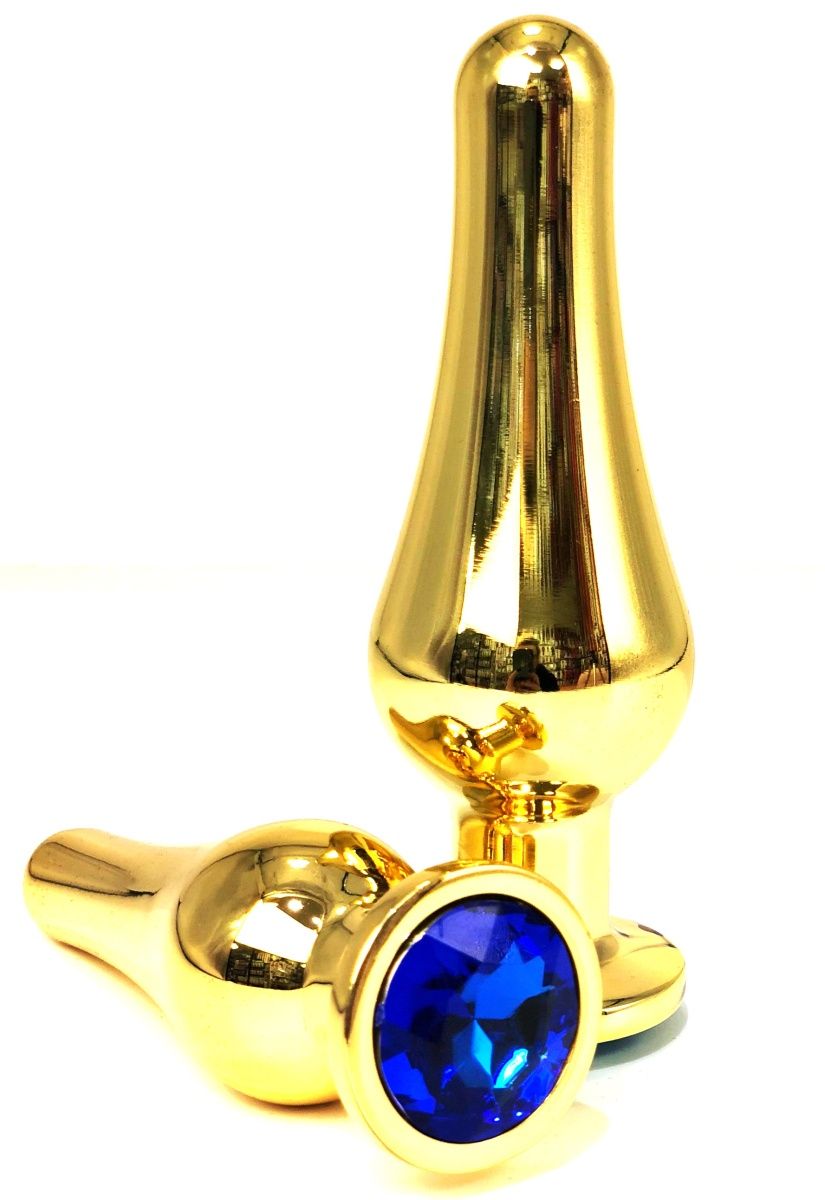 Анальная пробка металлическая удлиненная, 11.5 см, с синим кристаллом, цвет золотистый
