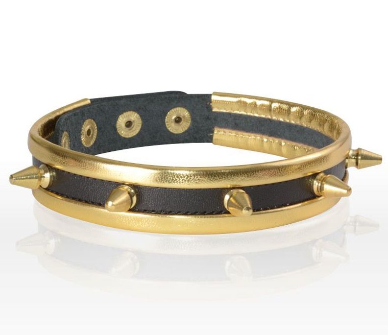 - Эффектный дизайн: Контрастное сочетание черной кожи и пяти золотистых металлических шипов придает образу дерзкий и стильный вид.