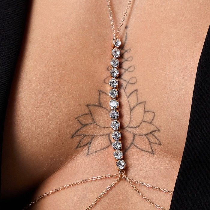 Это оригинальное украшение на грудь со стразами станет идеальным дополнением к вашему образу, добавляя нотку изысканности и стиля. Выполненное из тонких металлических цепочек, оно не только привлекает внимание, но и подчеркивает вашу индивидуальность. Благодаря своему золотистому цвету, украшение легко комбинируется с различными нарядами, делая вас центром внимания на любом мероприятии.