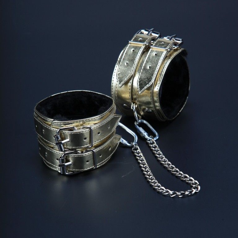 Оковы выполнены из качественной искусственной кожи с золотистым покрытием, что придаёт им роскошный вид. Внутренняя сторона обильно выстлана мягким мехом, который нежно соприкасается с кожей, предотвращая натирание и дискомфорт. Два регулируемых ремешка на каждом манжете позволяют точно подогнать размер под ваши анатомические особенности, обеспечивая плотную, но не сдавливающую фиксацию.