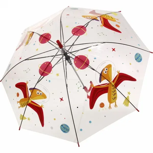 Яркий зонт 'Динозаврики' создан для детей, которые ценят стиль и надёжность. Его прозрачный купол с забавным принтом в виде мультяшных птиц и планет делает каждую прогулку под дождём увлекательной.