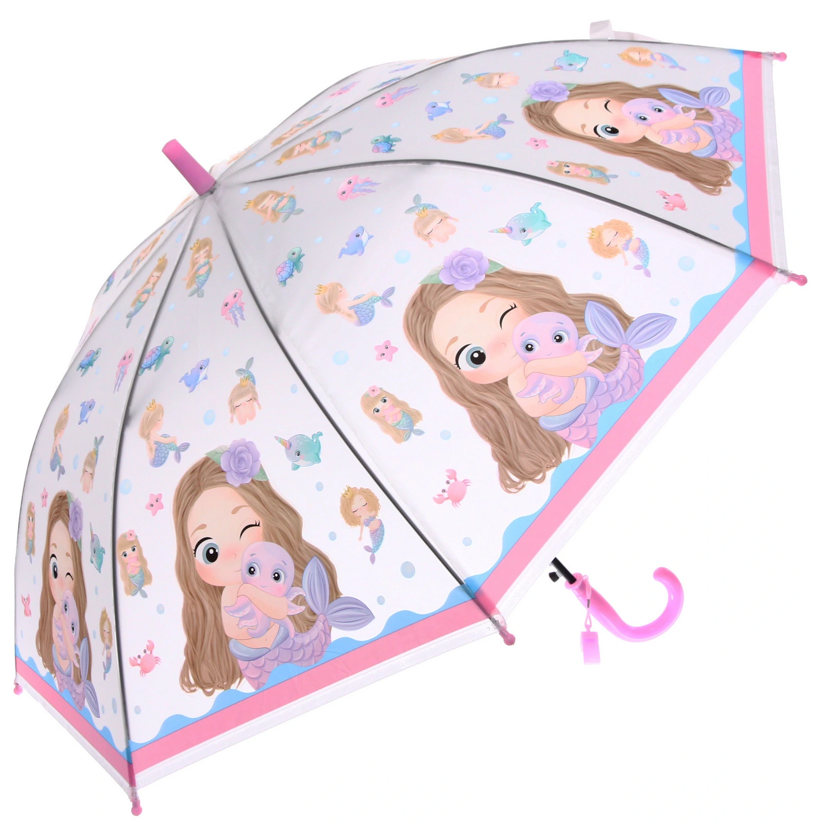 Детский зонт «Русалочка» создан для того, чтобы прогулки под дождем превращались в маленькое приключение. Красочный принт с русалками и морскими обитателями поднимает настроение, а удобная конструкция делает использование простым и комфортным для ребенка.