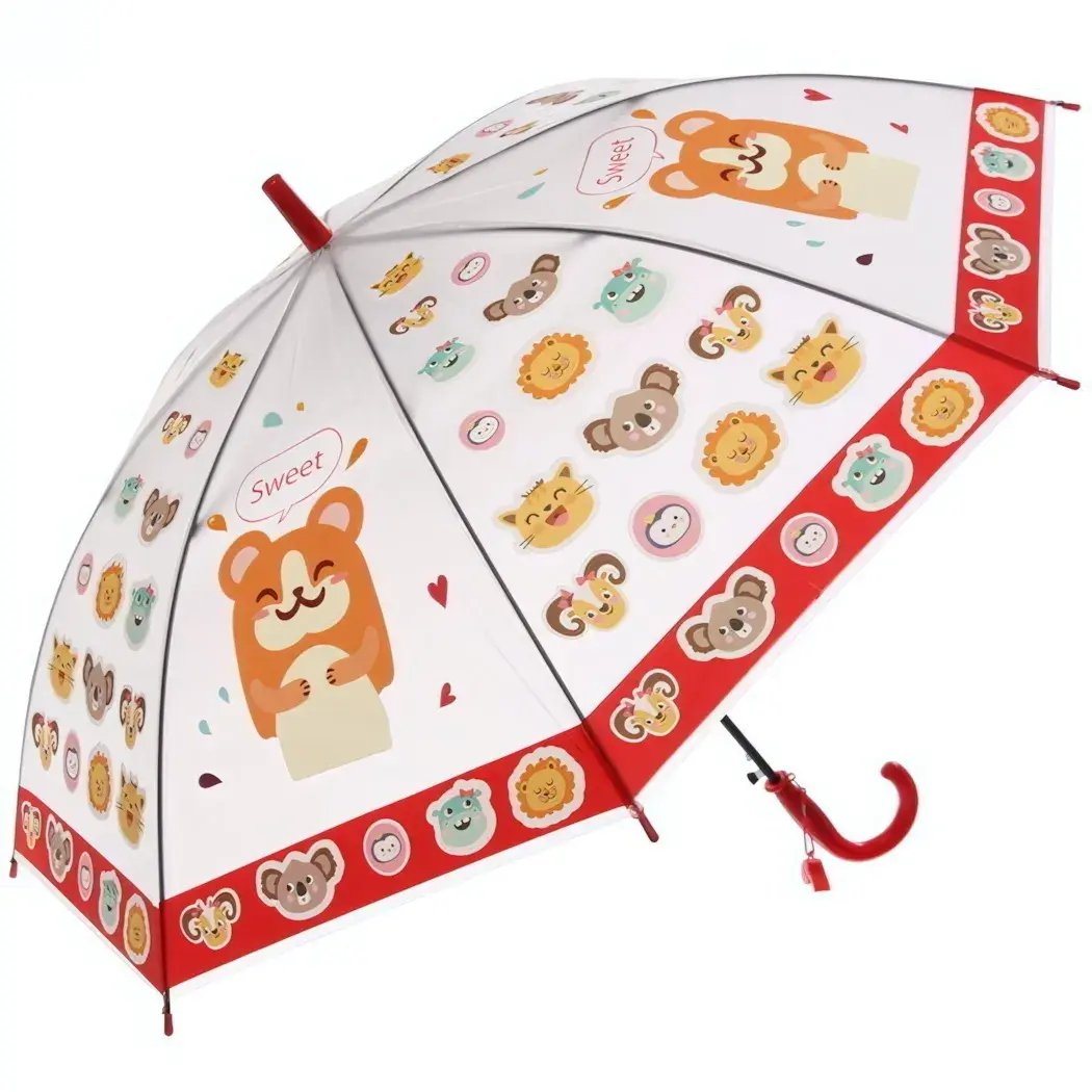 Размер купола составляет 86 см в диаметре, а в сложенном виде зонт имеет длину 65 см, что делает его удобным для хранения и транспортировки. Красная отделка по краям купола добавляет стильный акцент, а разнообразные мультяшные изображения зверушек делают его любимым аксессуаром вашего ребенка.
