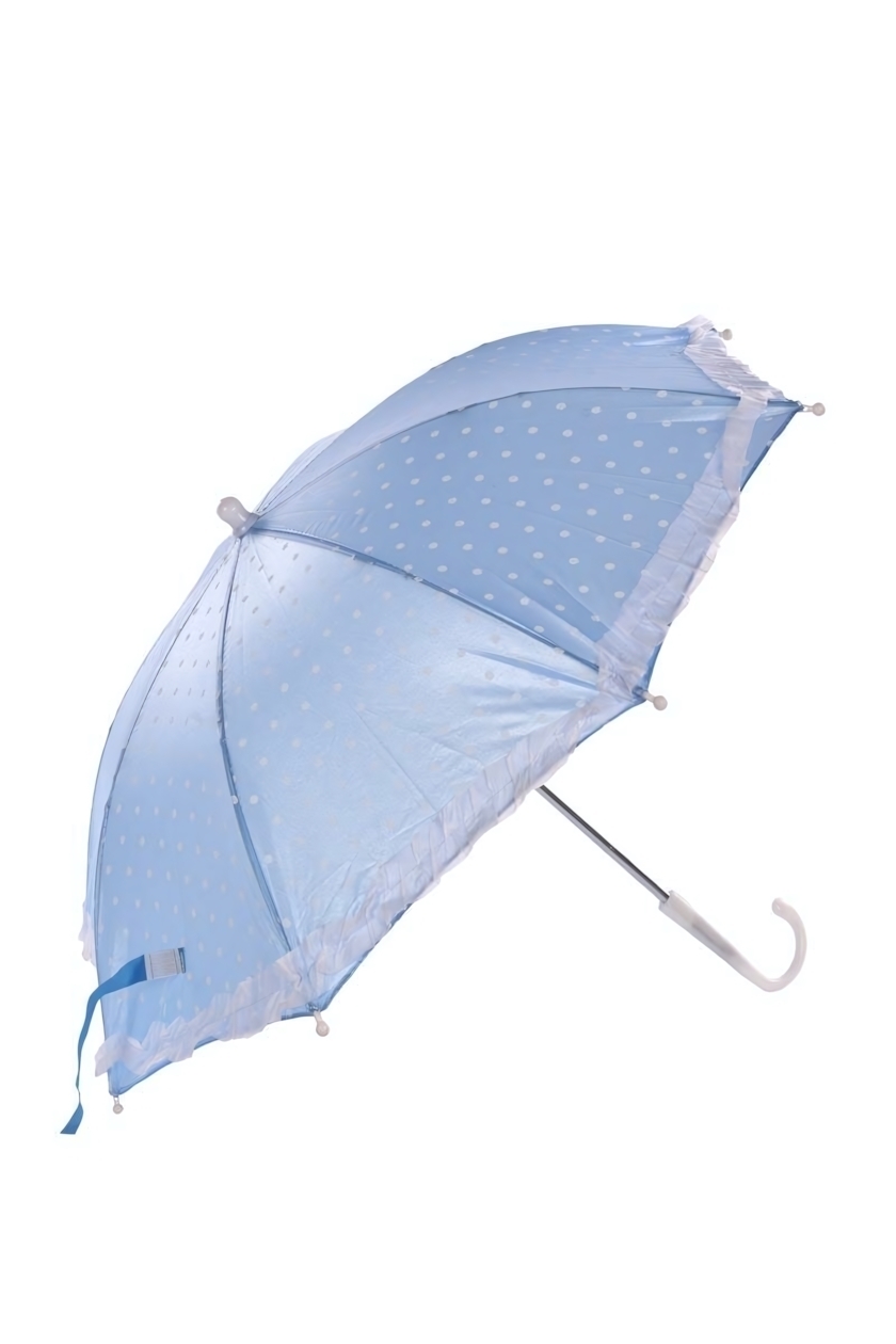 Зонт украшен милыми белыми горошками на нежно-голубом фоне, а по краю купола добавлена элегантная белая рюша. Такой дизайн привлечёт внимание и поднимет настроение в пасмурный день.