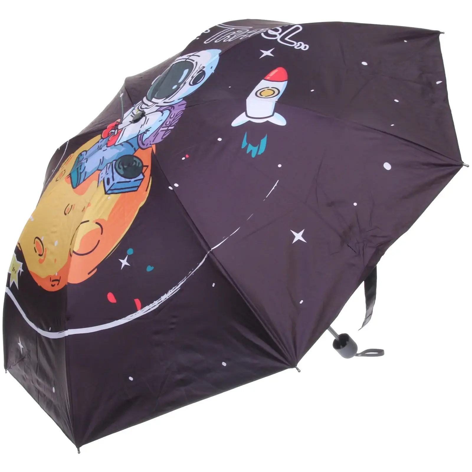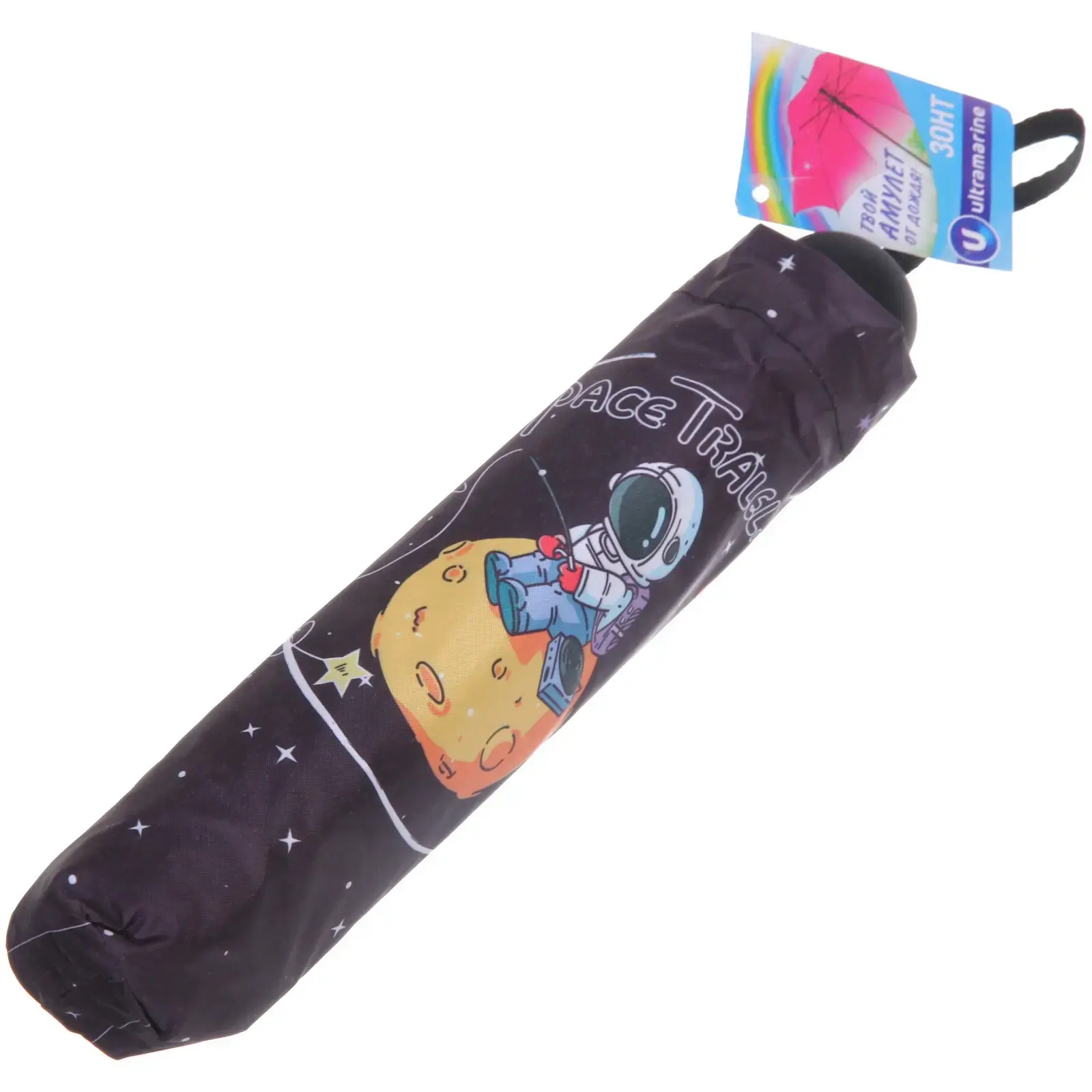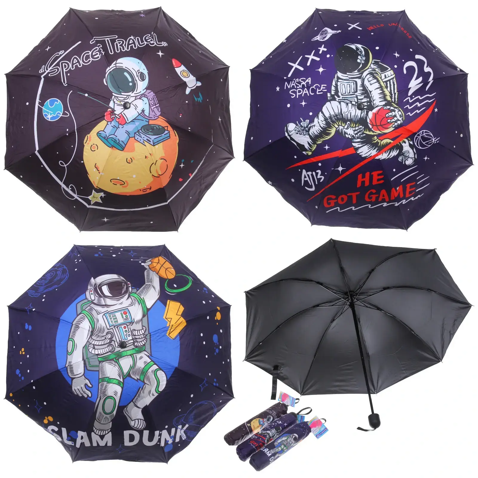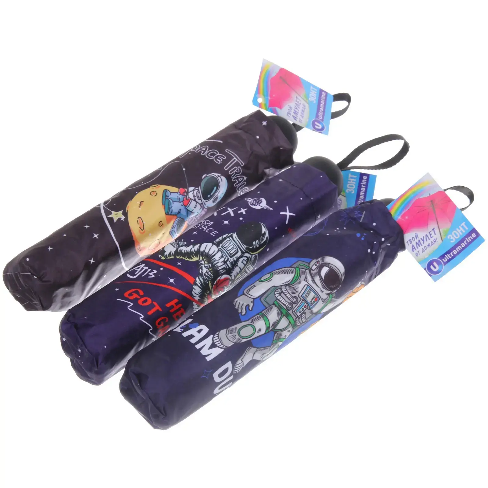 Зонт доступен в микс из 4 дизайнов: космические путешествия, астронавты, планеты и звезды. Цветовая гамма включает темно-синие, черные и фиолетовые оттенки с яркими принтами. Отгружается один товар, цвет определяется случайным образом.