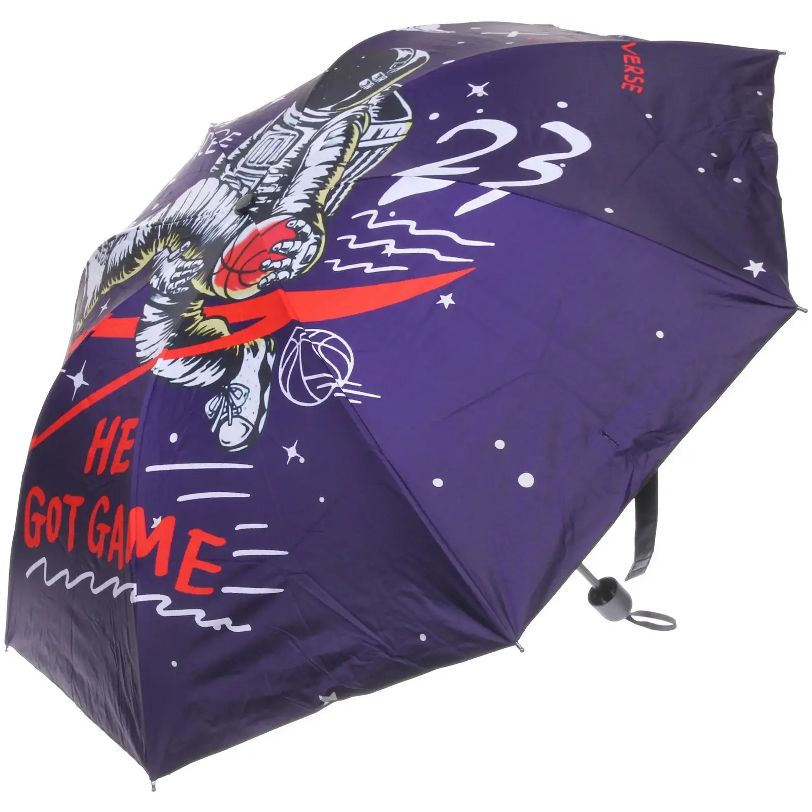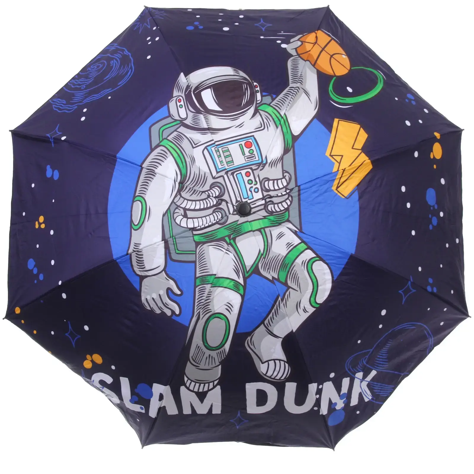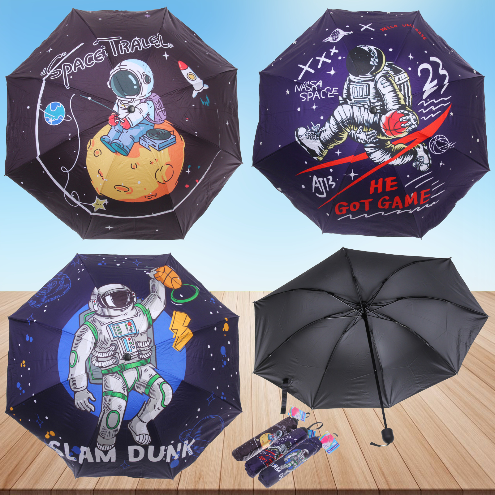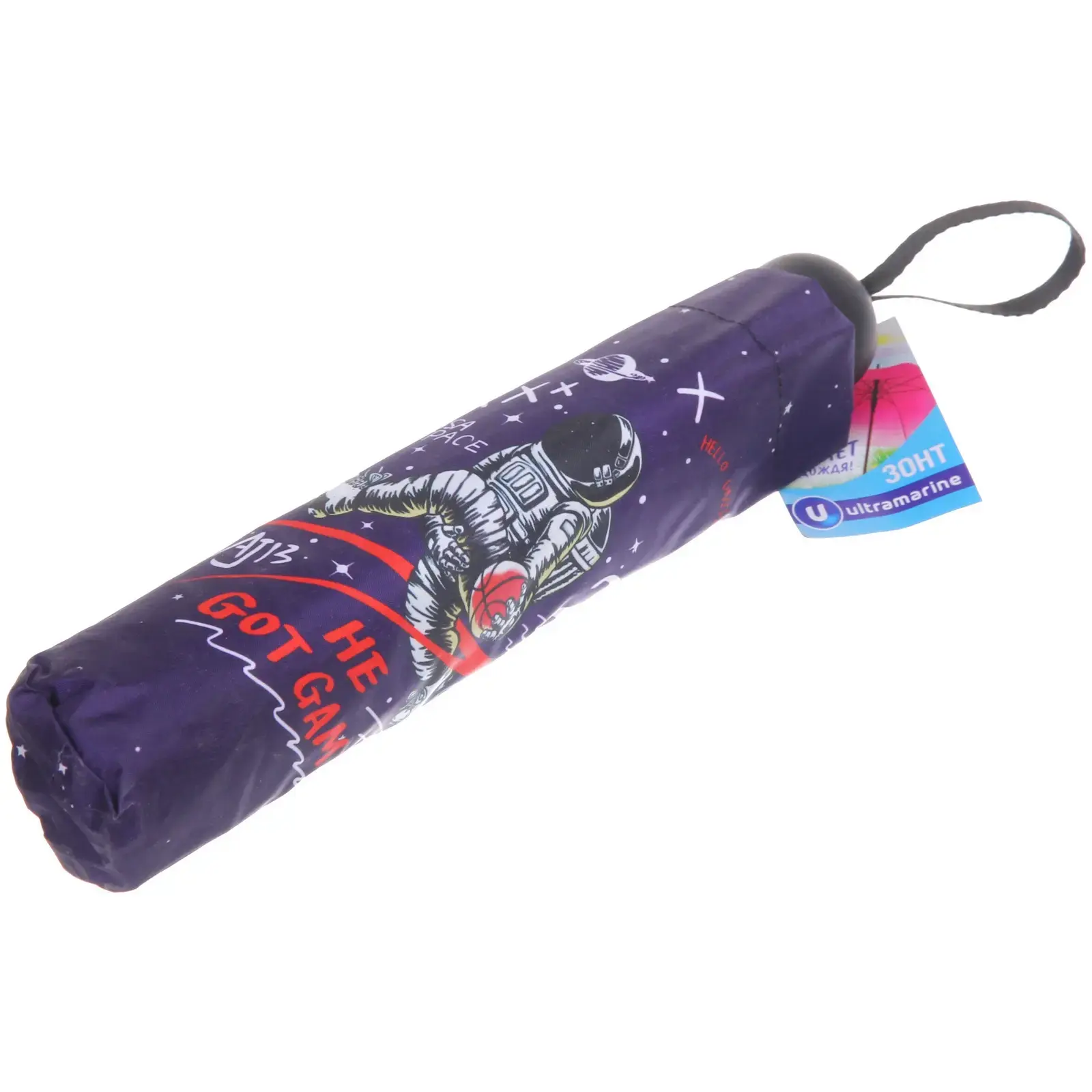 Зонт доступен в микс из 4 дизайнов: космические путешествия, астронавты, планеты и звезды. Цветовая гамма включает темно-синие, черные и фиолетовые оттенки с яркими принтами. Отгружается один товар, цвет определяется случайным образом.