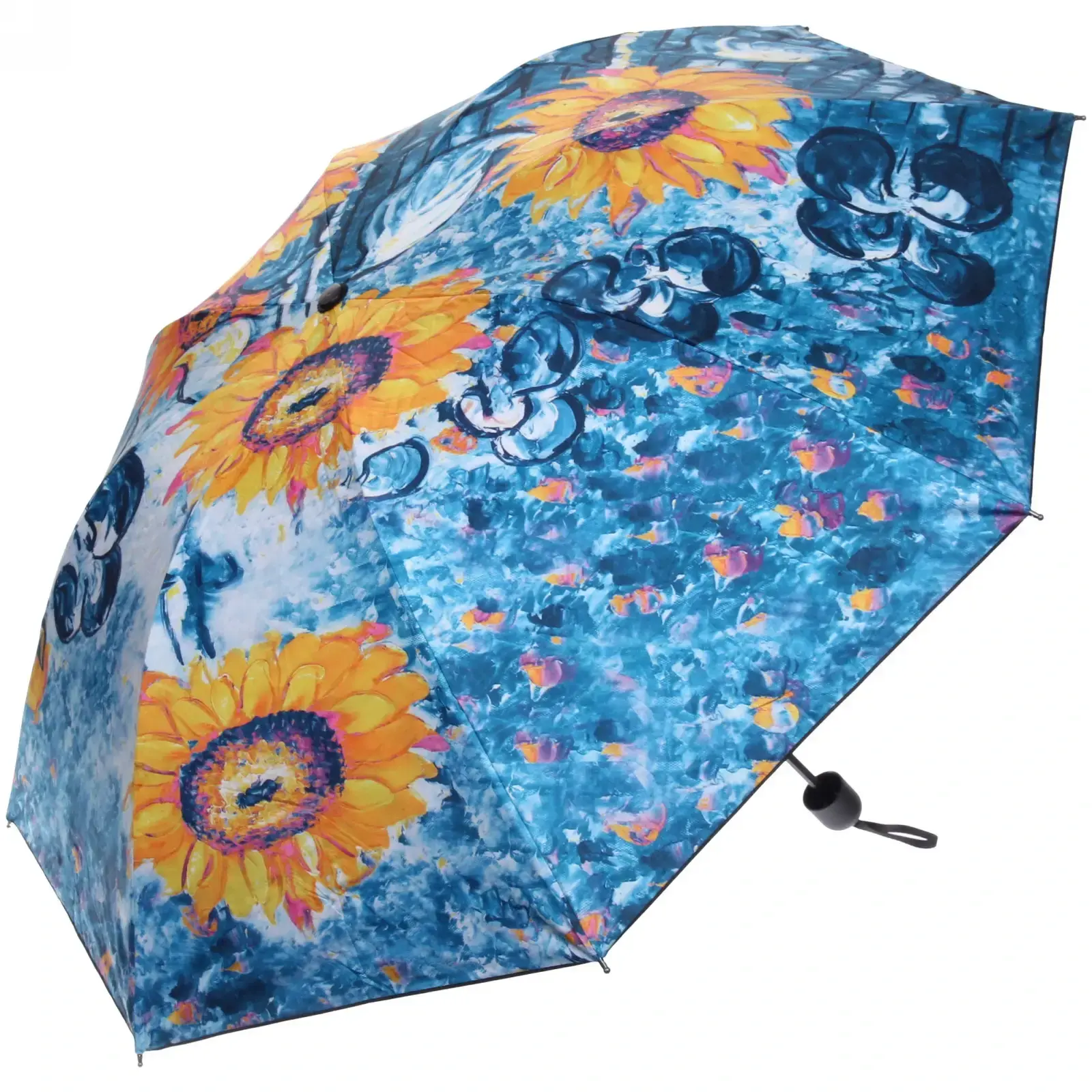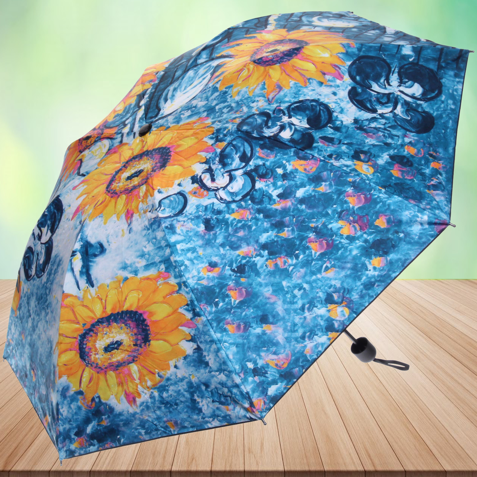 Этот зонт не просто укроет от непогоды — он станет ярким аксессуаром в вашем гардеробе. Благодаря дизайну с изображением подсолнухов на голубом фоне, он привлекает внимание и создает летнее настроение в любую погоду.
