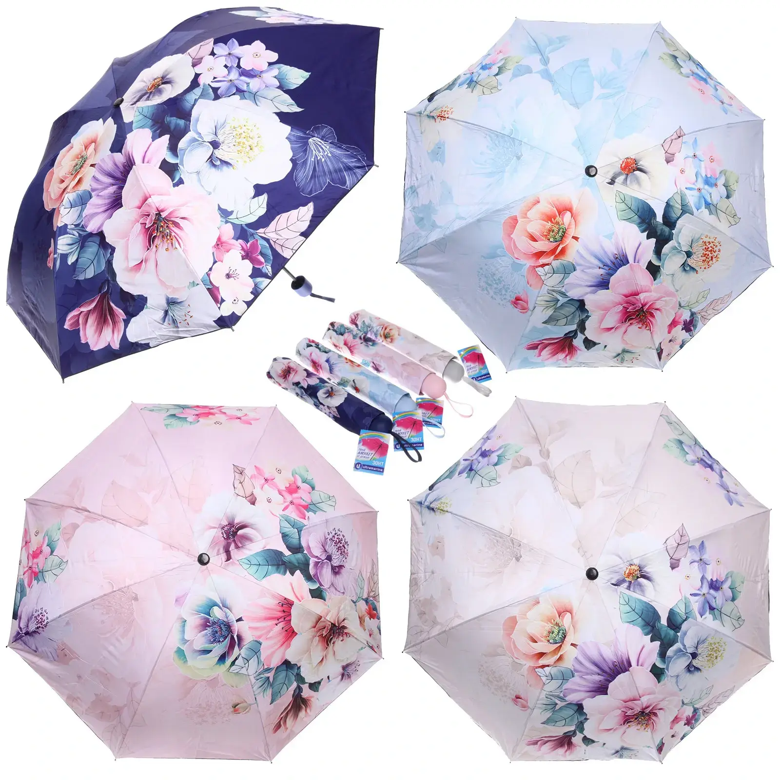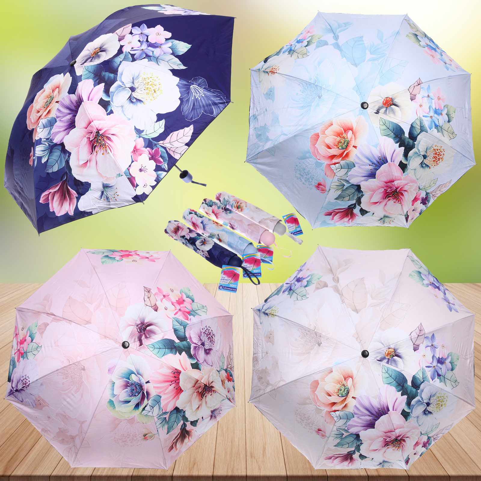 Усиленные пластиковые соединения и армированные спицы продлевают срок службы. Специальная конструкция купола предотвращает выворачивание при сильных порывах ветра. 4 варианта расцветок с модными цветочными принтами позволяют подчеркнуть ваш стиль.