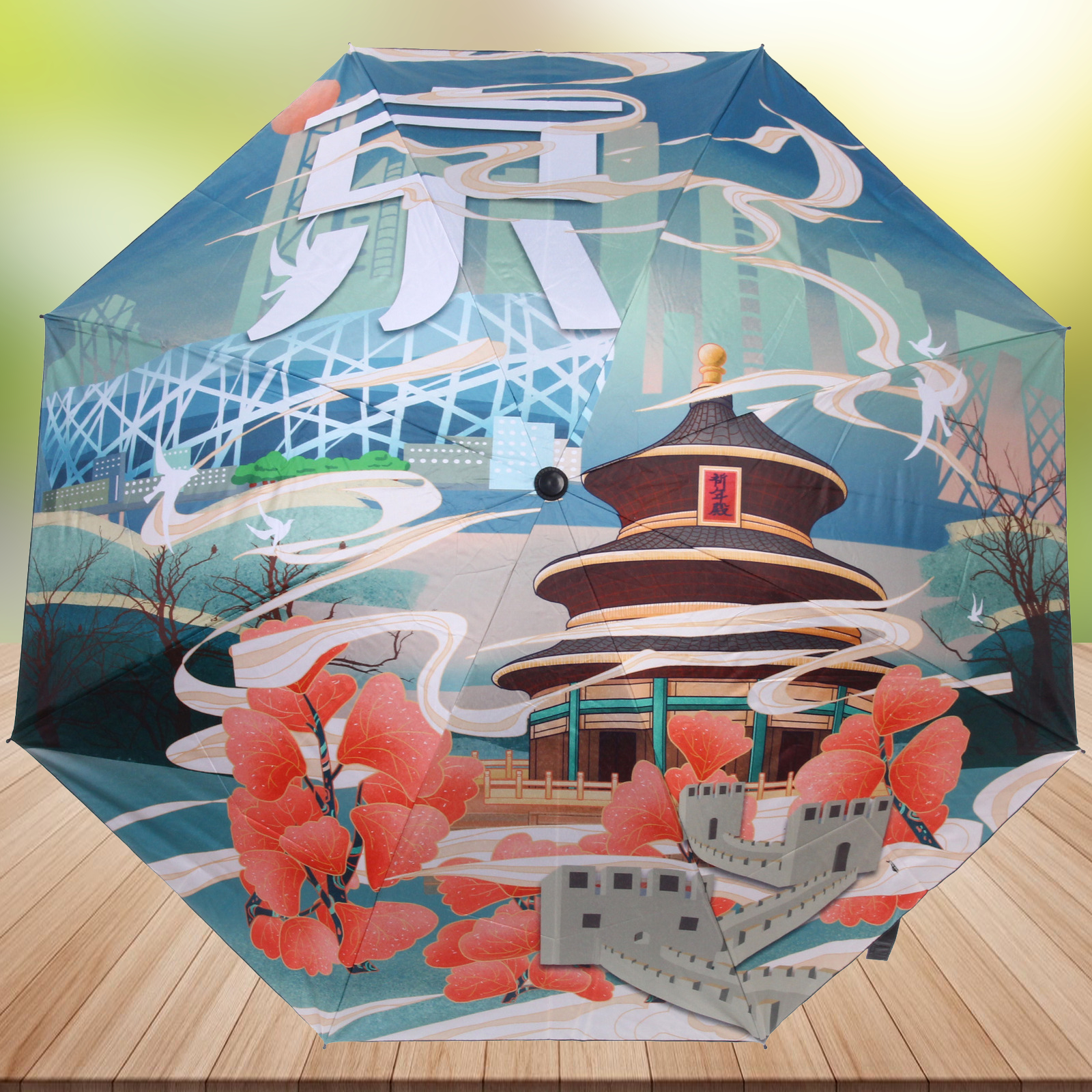 Цвет товара отгружается в ассортименте — вы получите один зонт случайного цвета из доступной коллекции. Принт может включать стилизованные изображения пагод, Великой Китайской стены или абстрактные геометрические узоры в голубых, оранжевых и зелёных тонах.