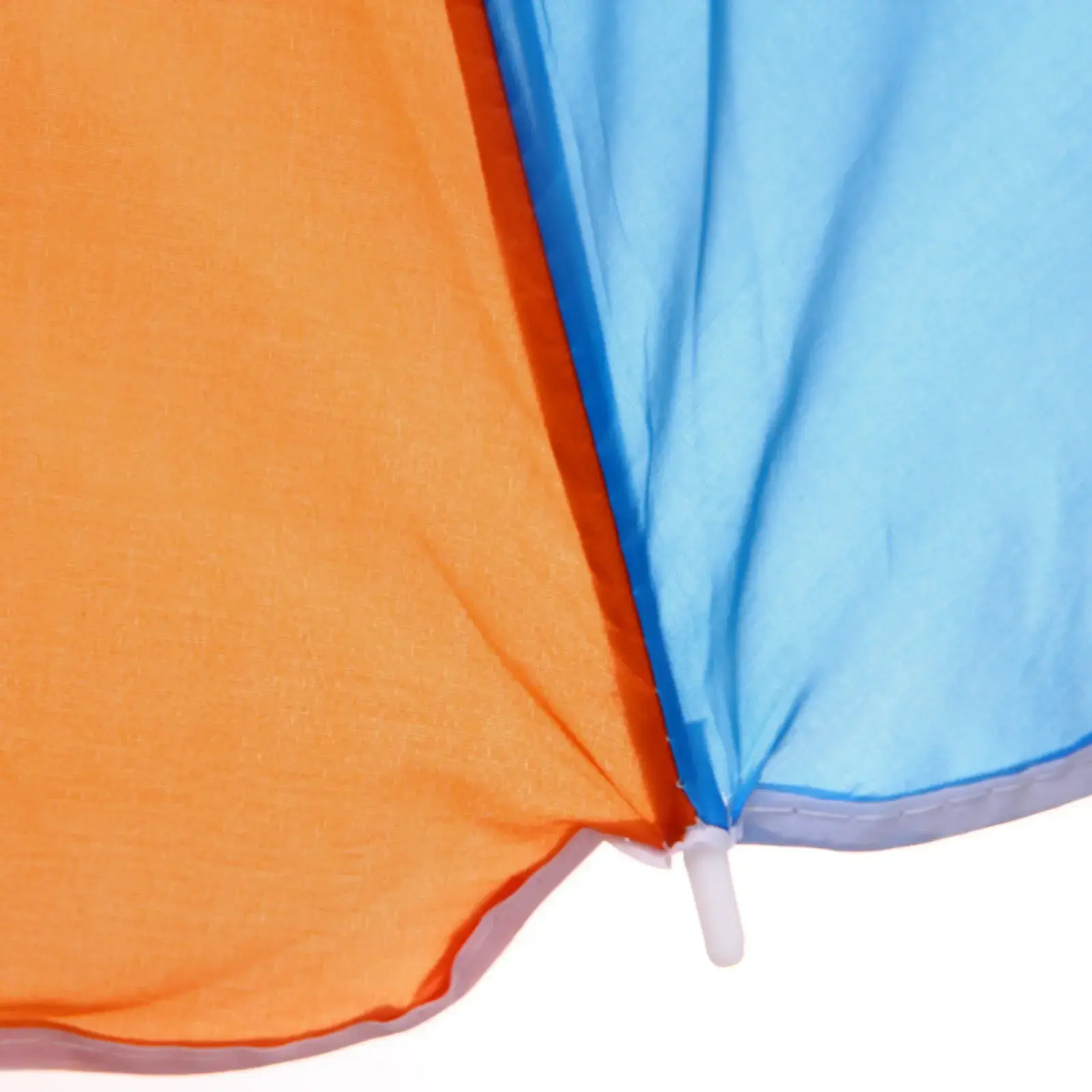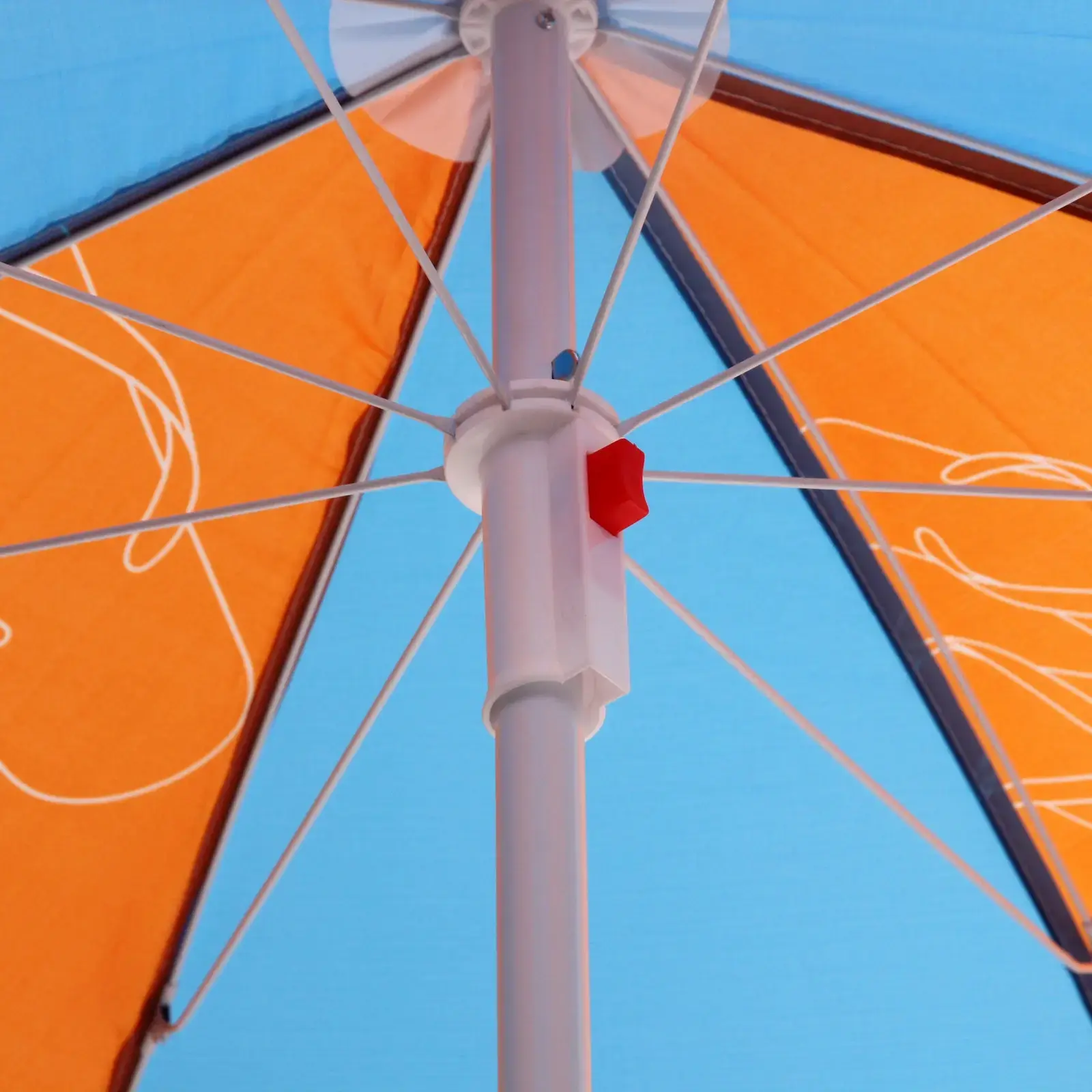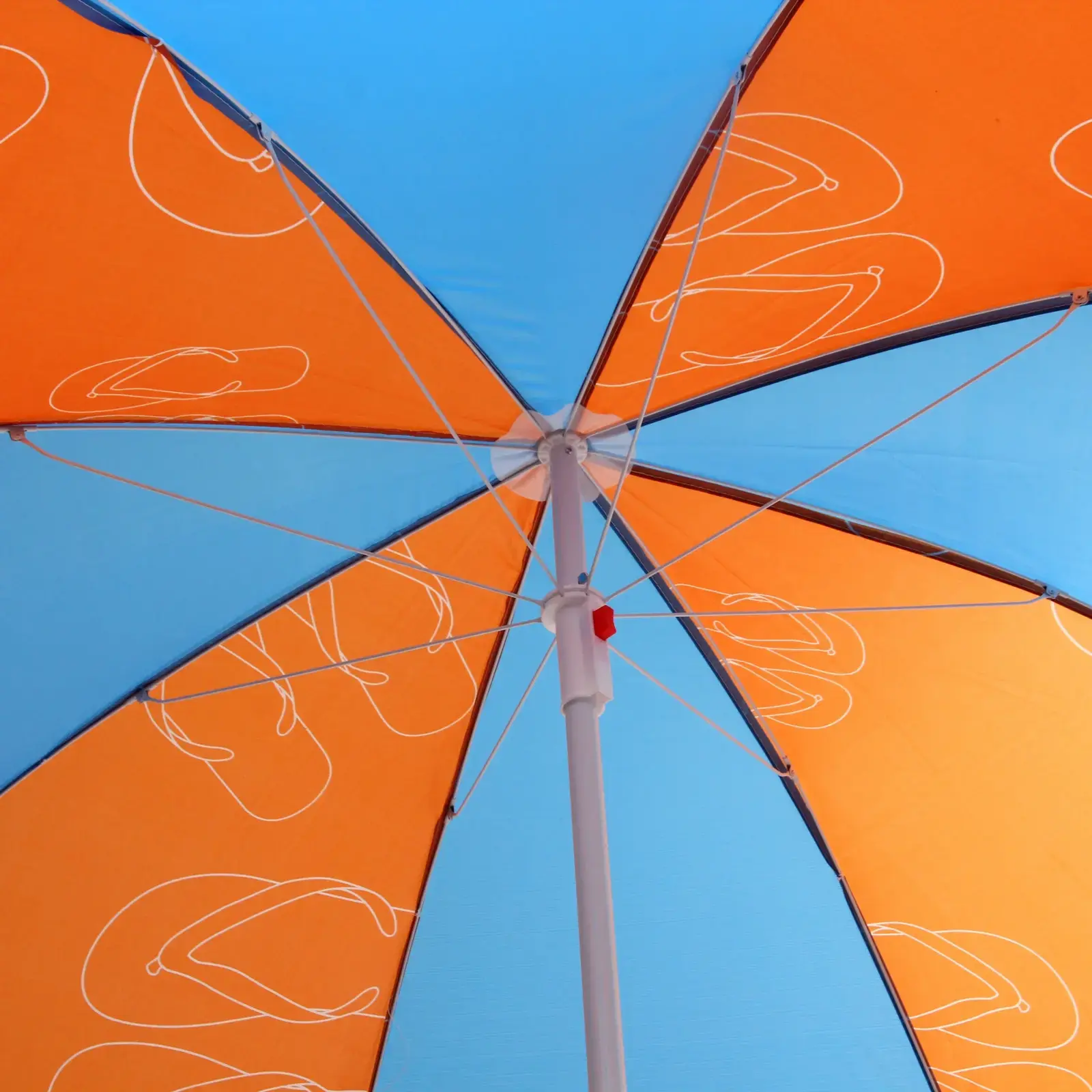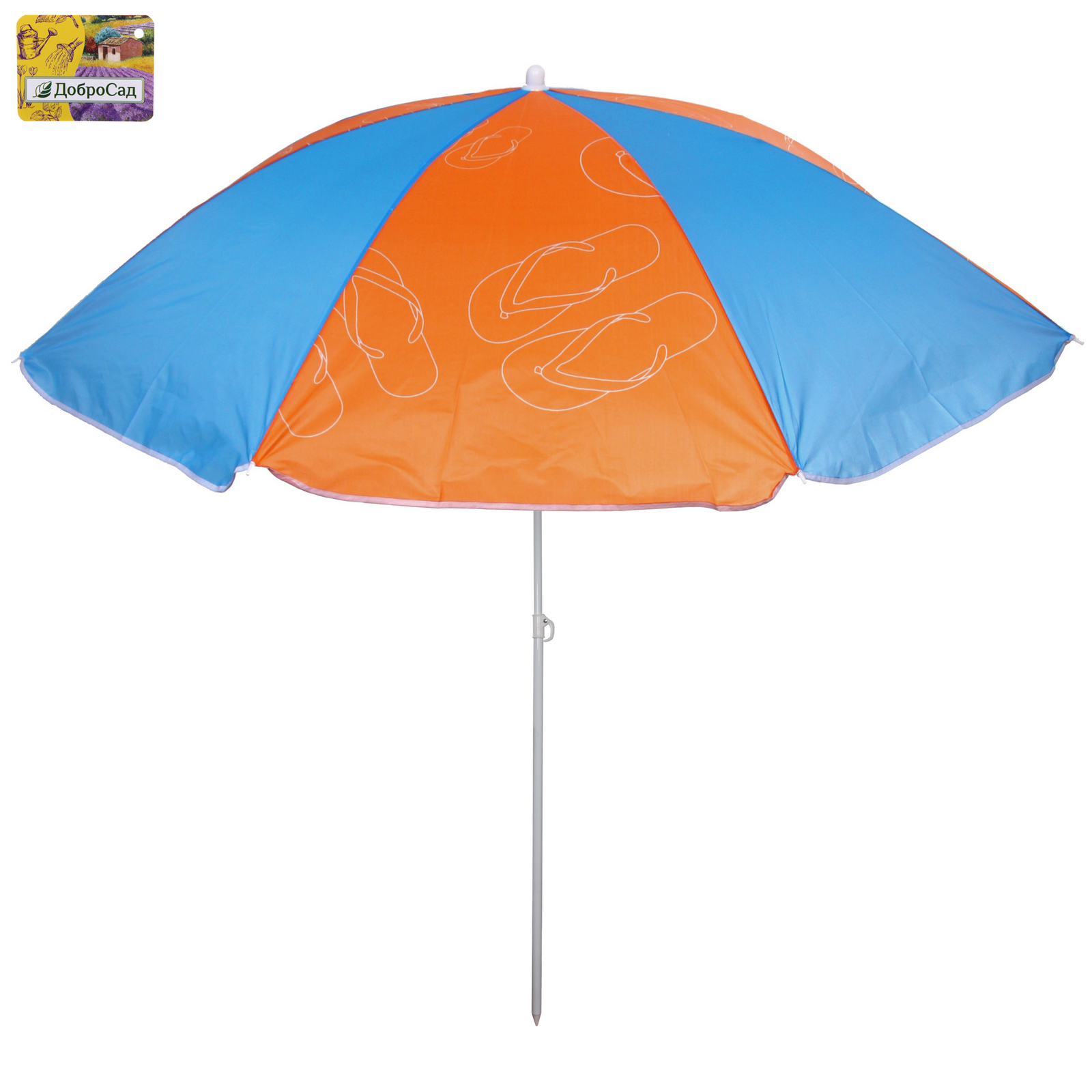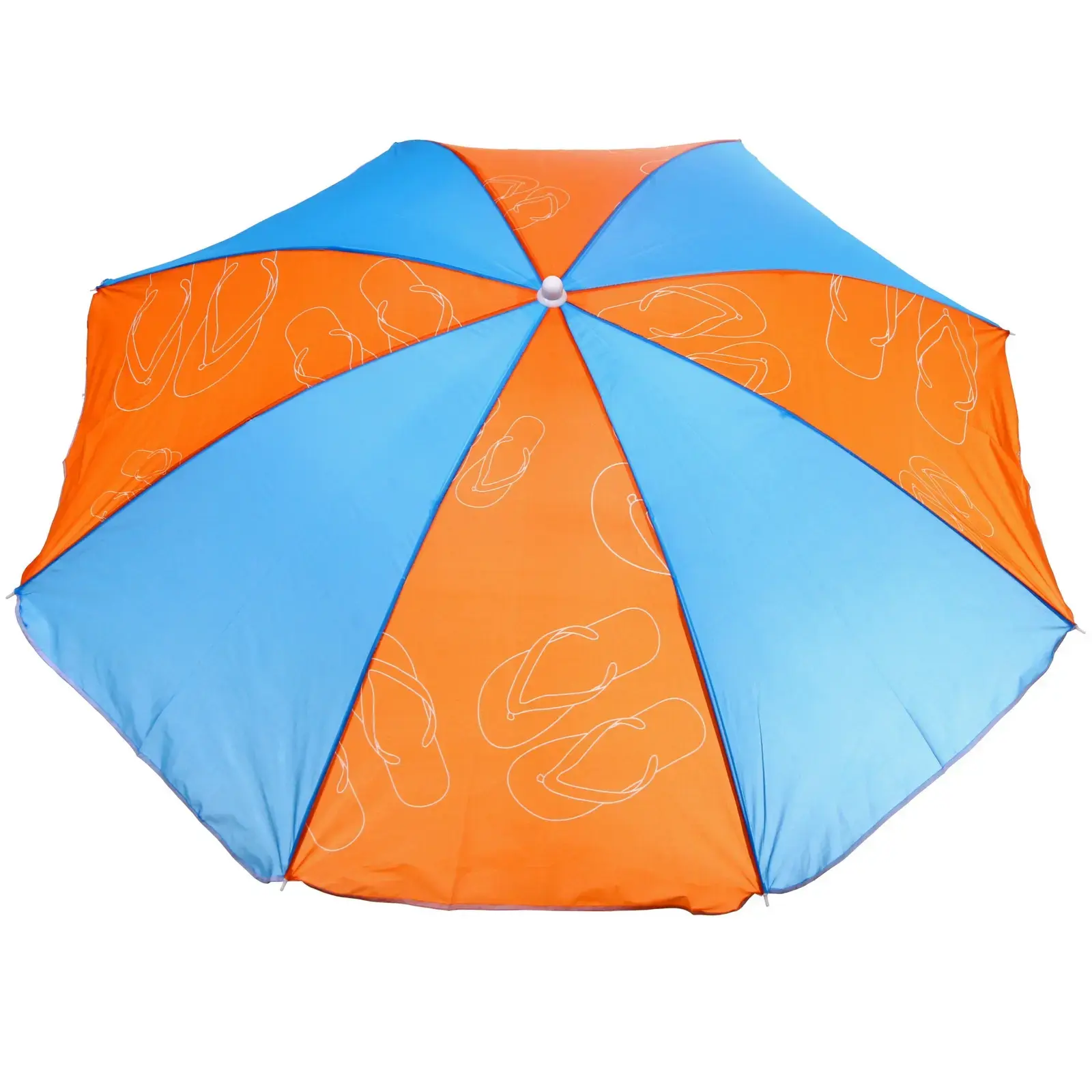 Зонт представлен в ярких цветах: верхняя часть синего цвета, нижняя — оранжевого с рисунком в виде шлепанцев, что добавляет летнего настроения. Его размеры (D=170 см, h=190 см) делают его идеальным для использования на пляже или в саду. Не упустите возможность сделать ваш отдых более комфортным с помощью этого стильного и практичного пляжного зонта!
