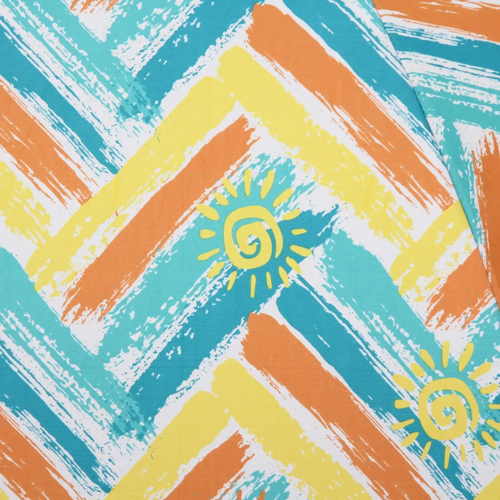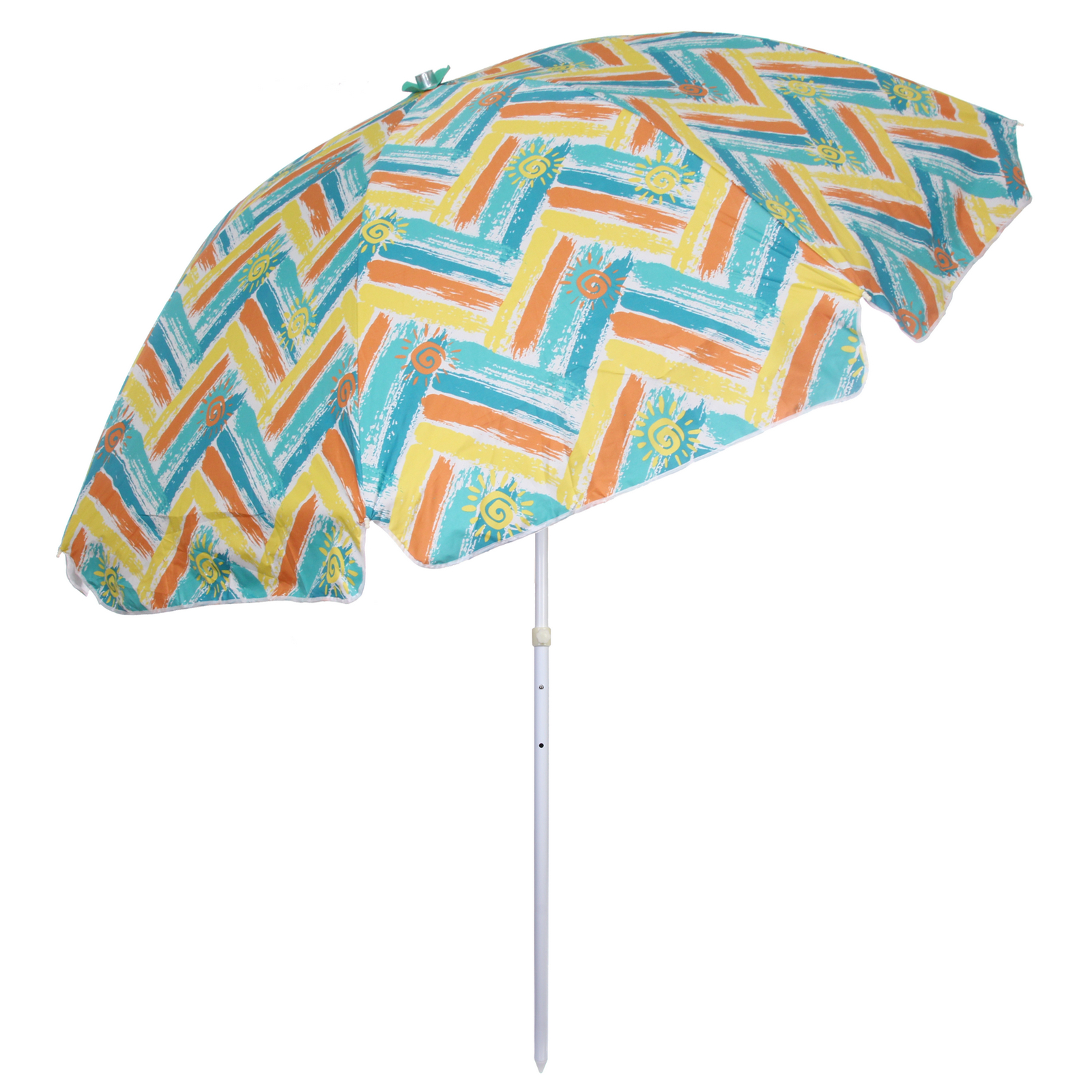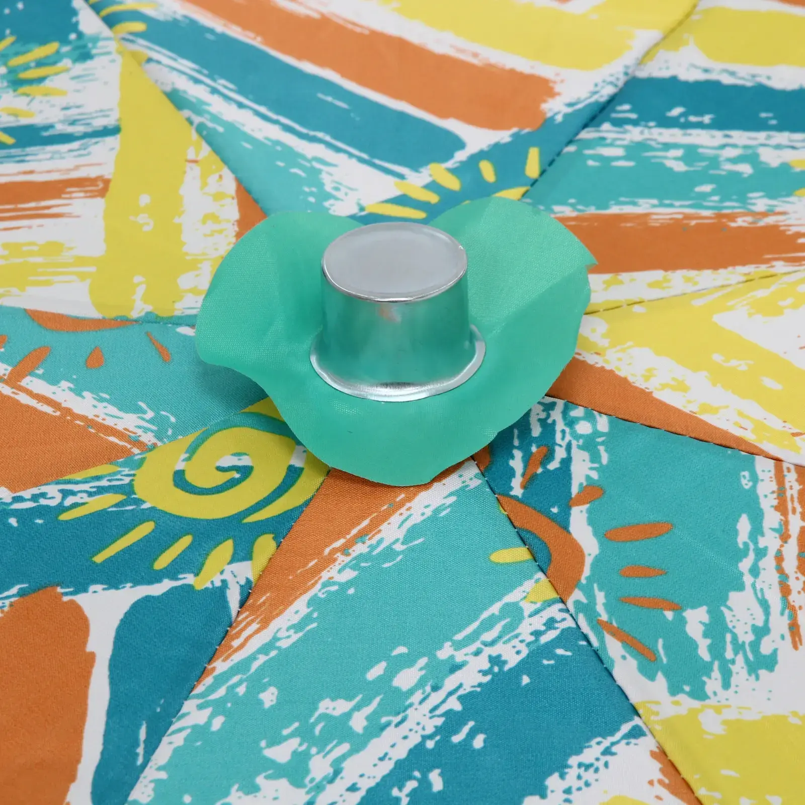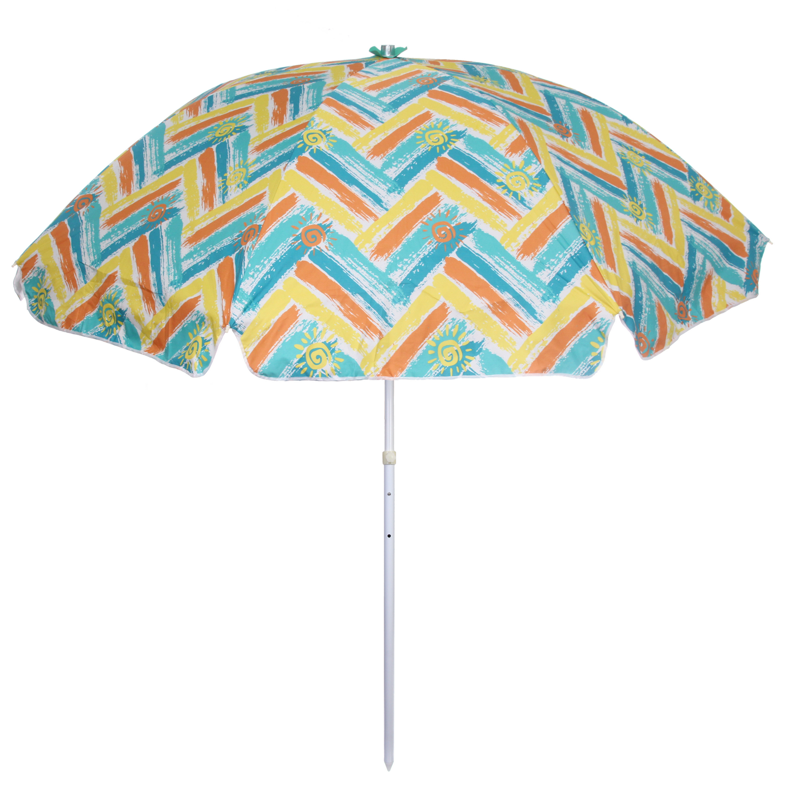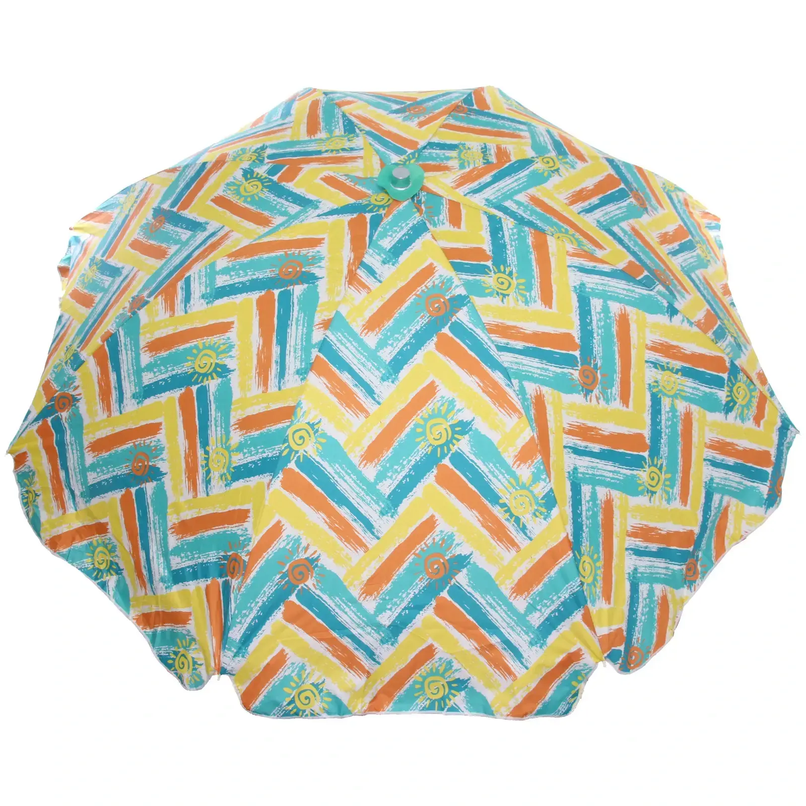 Зонт выполнен из качественных материалов: металлический каркас и водоотталкивающее покрытие из полиэстера. Яркий и привлекательный дизайн с цветным узором добавляет стильный акцент на любом пляже. Возьмите его с собой и наслаждайтесь комфортным отдыхом на солнце без ущерба для своего комфорта!