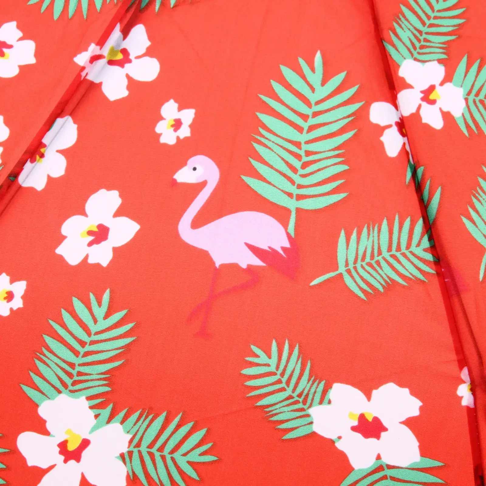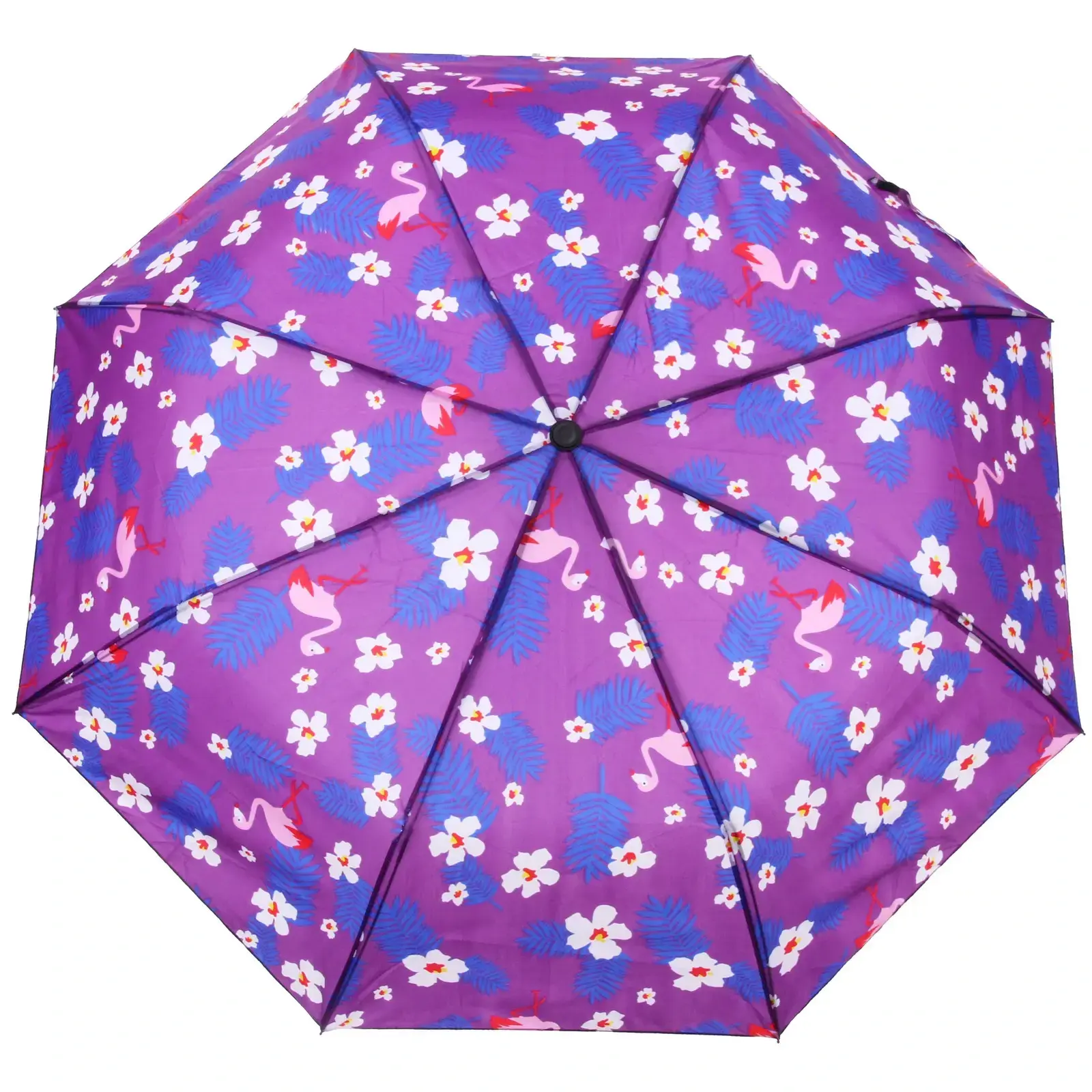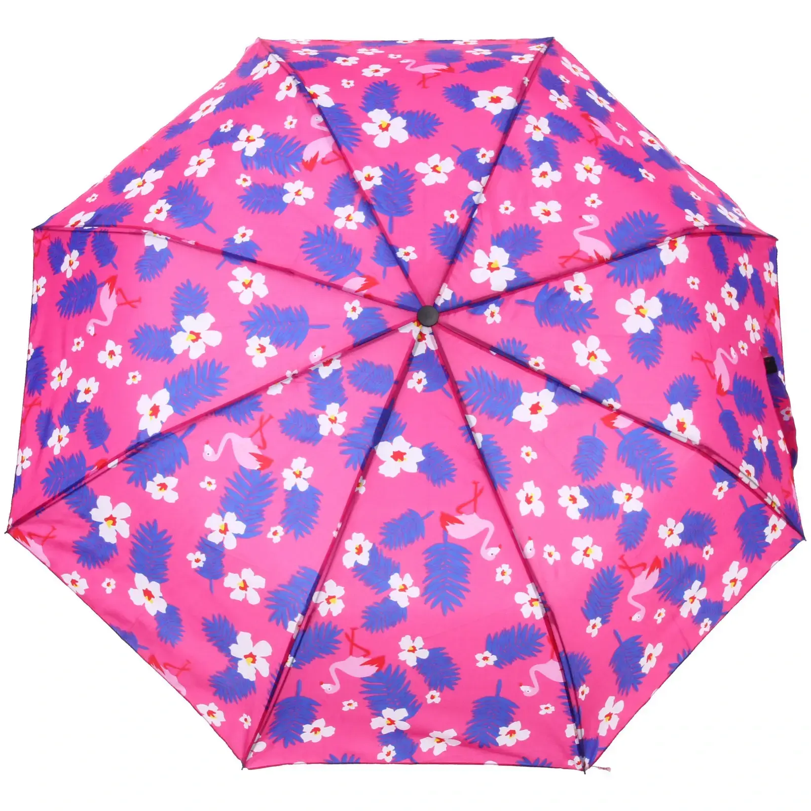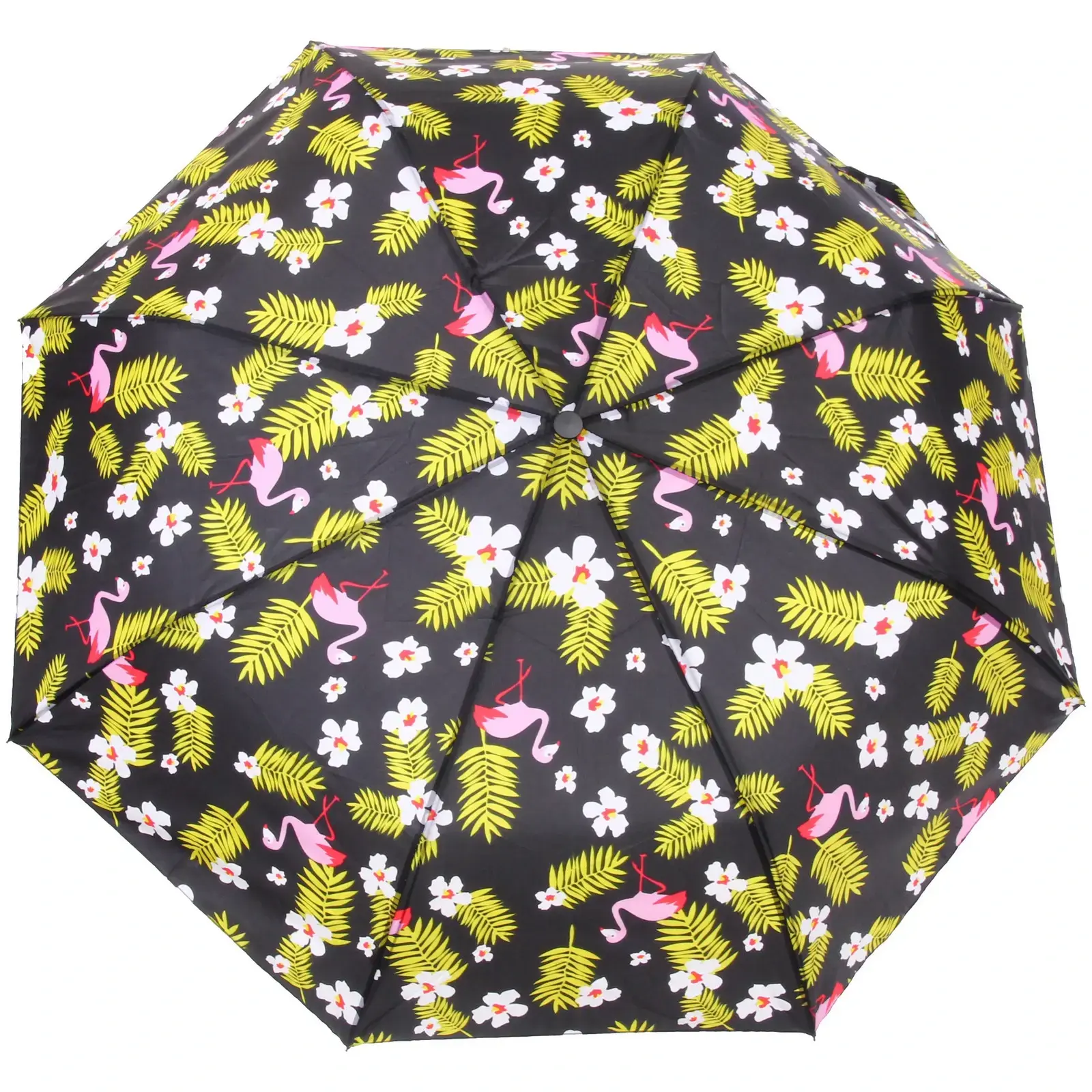 Зонт представлен в ассортименте из 6 ярких расцветок с тропическими мотивами: фламинго, экзотические цветы и листья на различных цветовых базах (розовый, фиолетовый, черный и другие). Цвет определяется случайным образом при отгрузке.