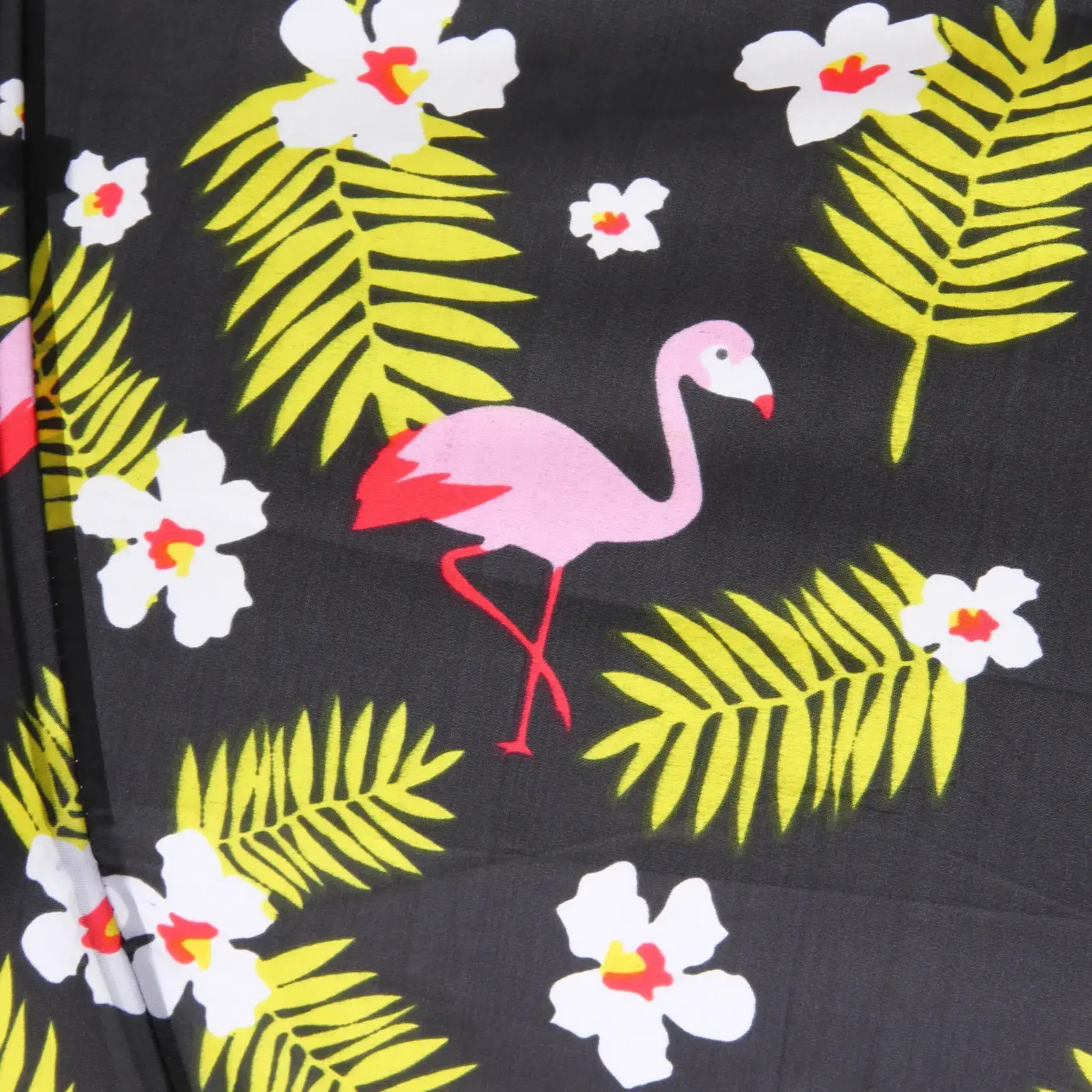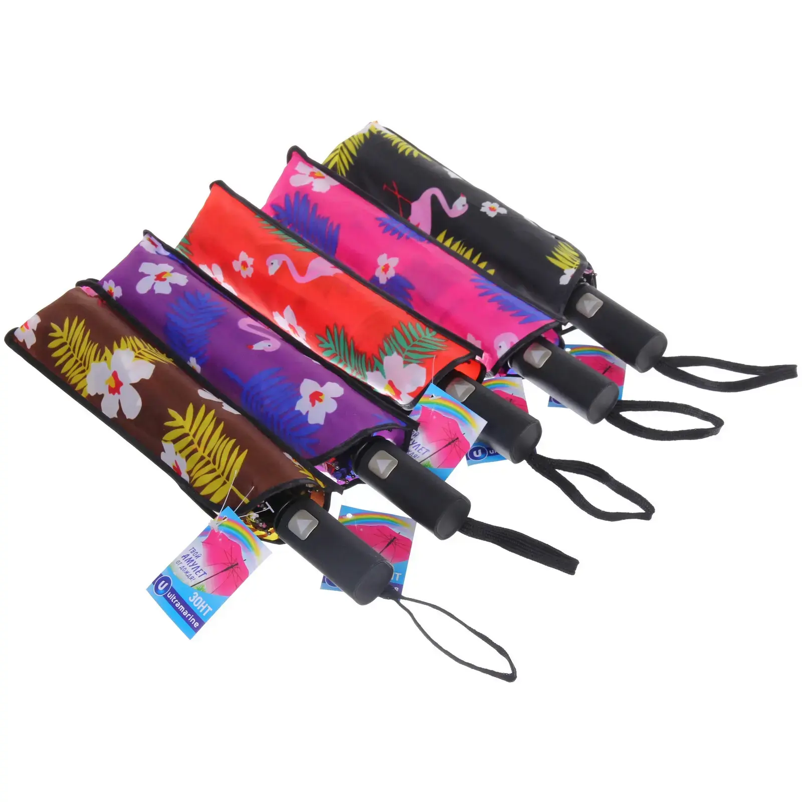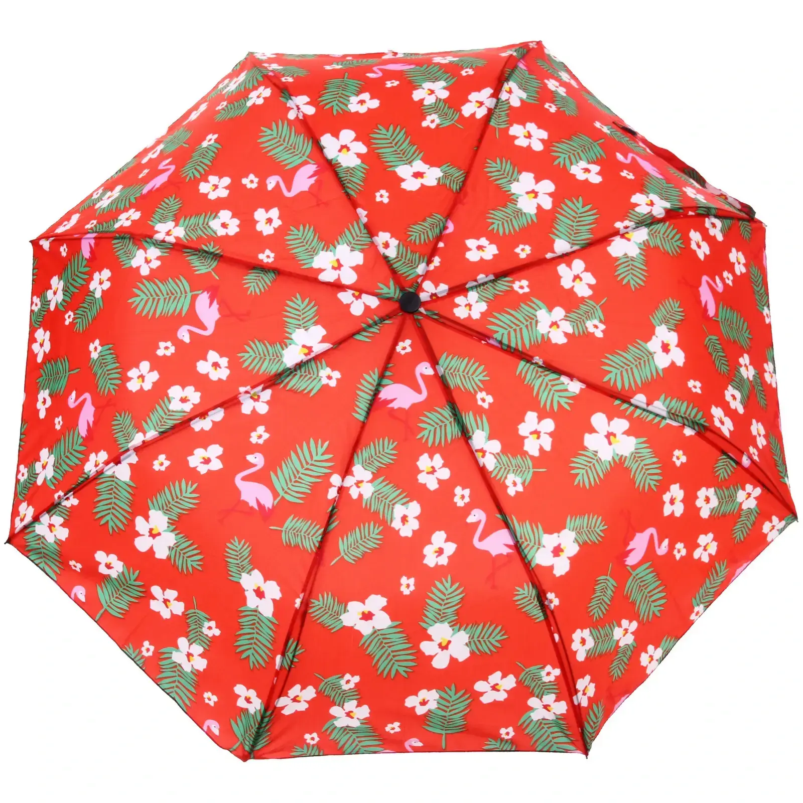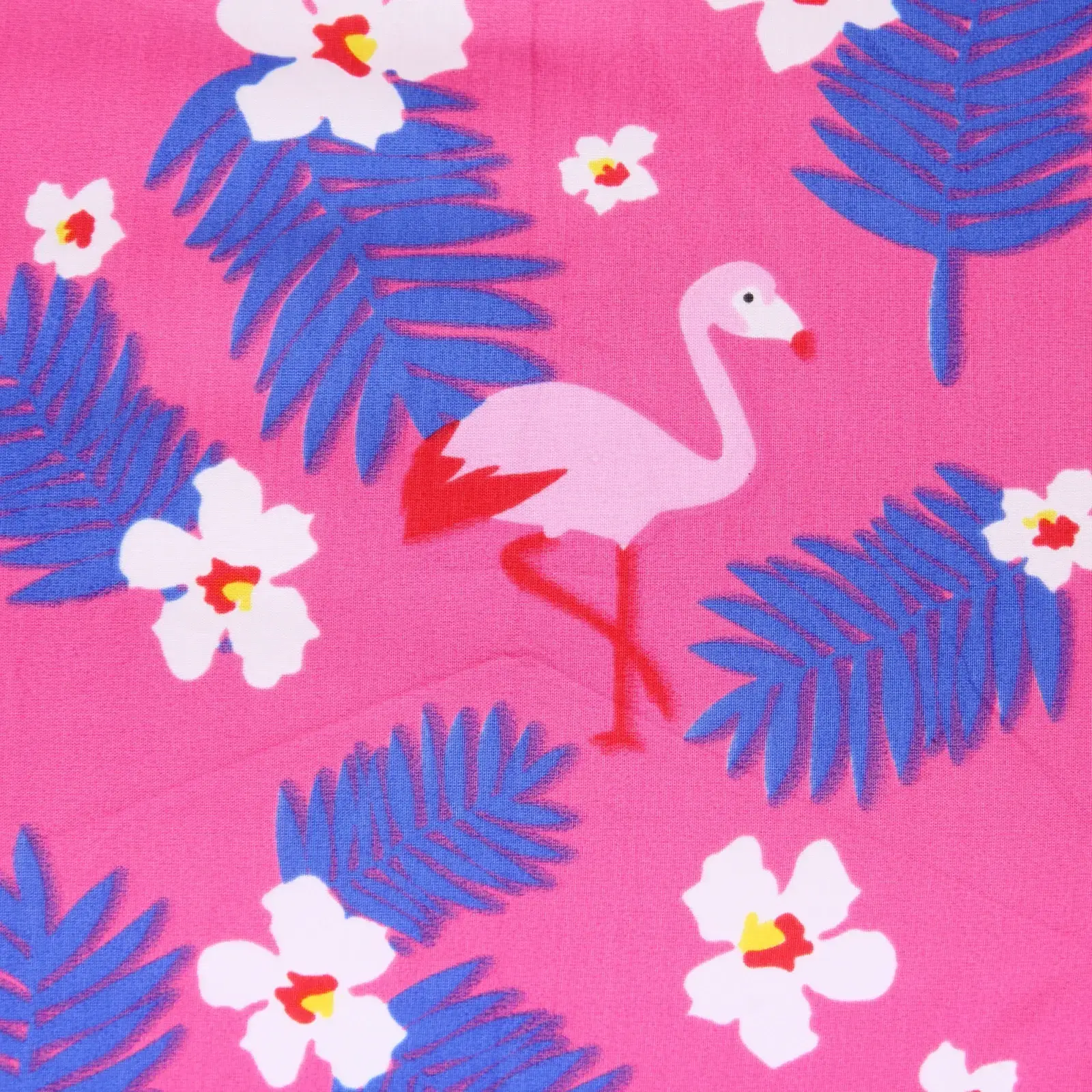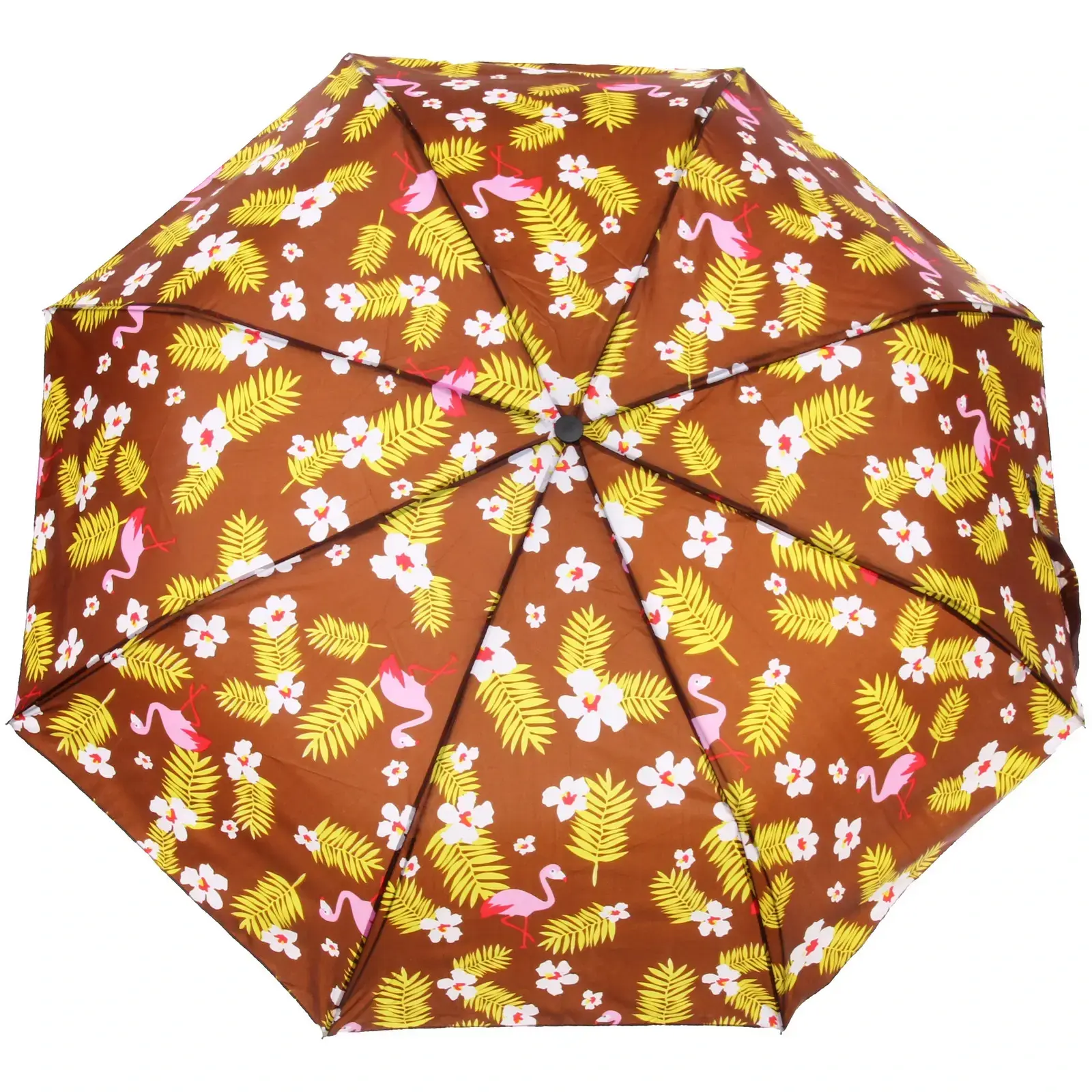 Зонт представлен в ассортименте из 6 ярких расцветок с тропическими мотивами: фламинго, экзотические цветы и листья на различных цветовых базах (розовый, фиолетовый, черный и другие). Цвет определяется случайным образом при отгрузке.