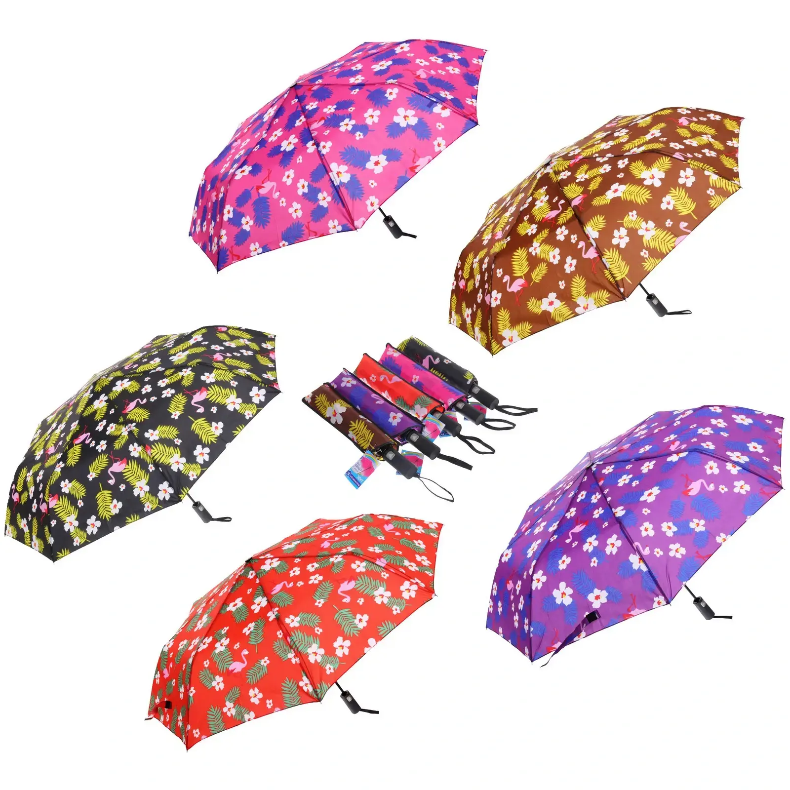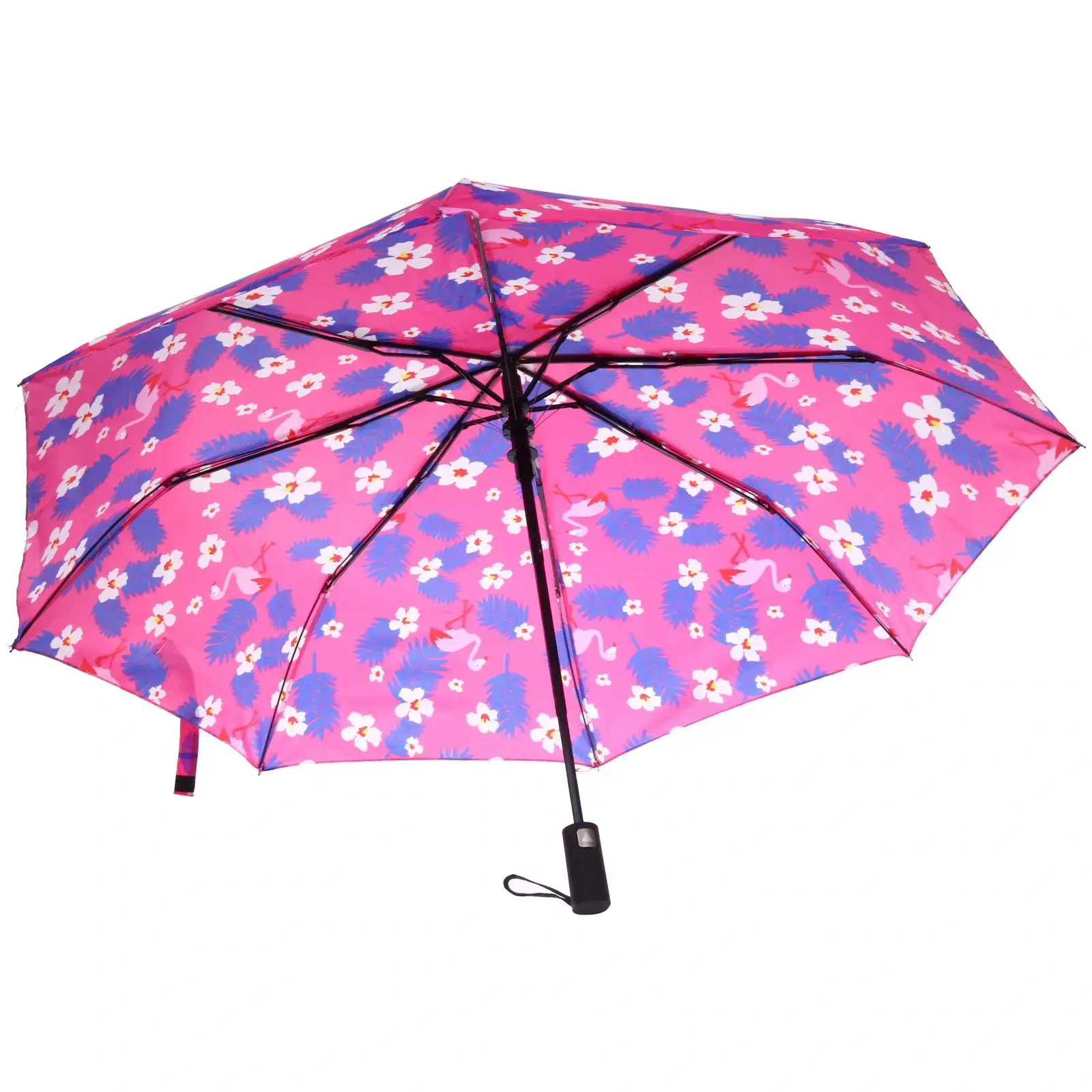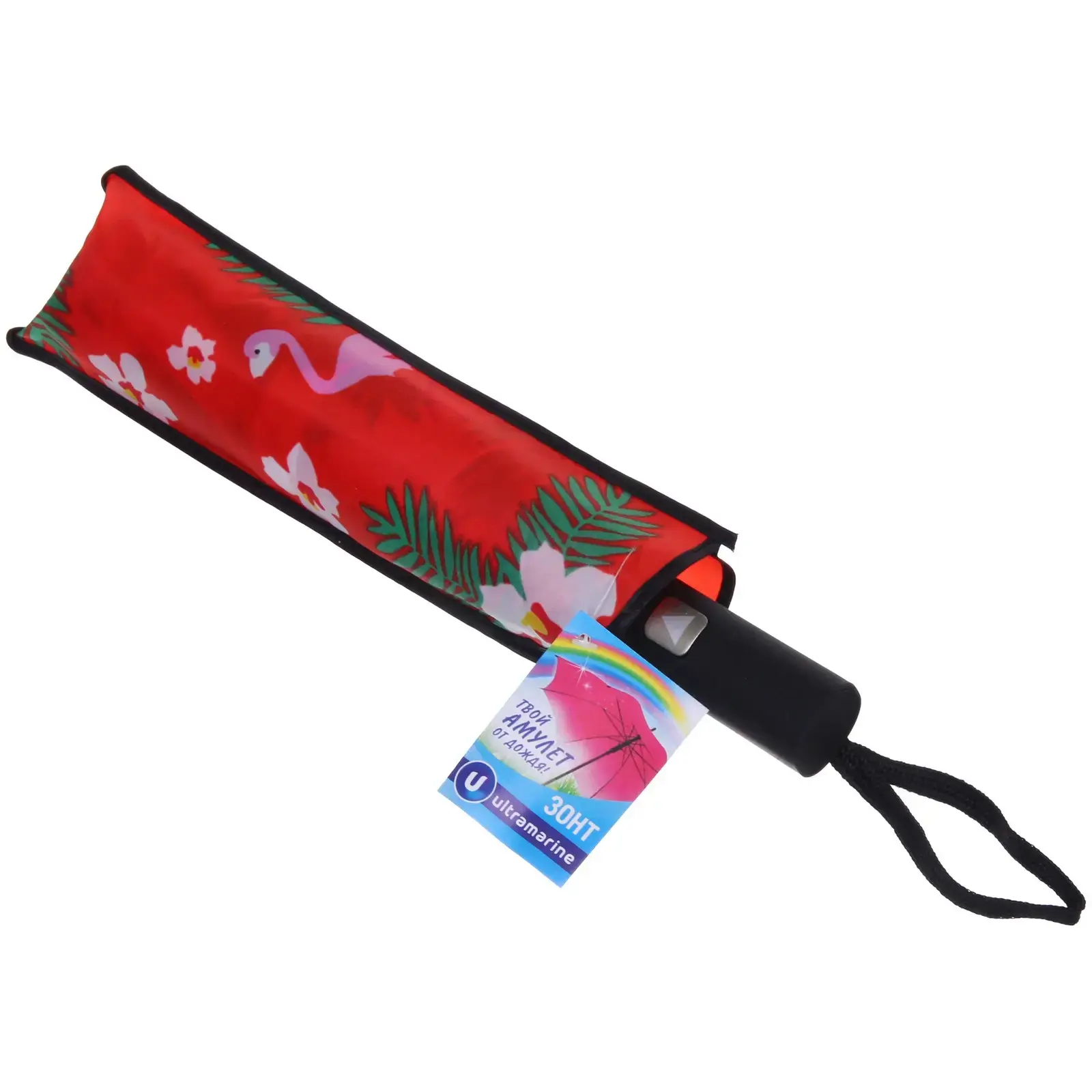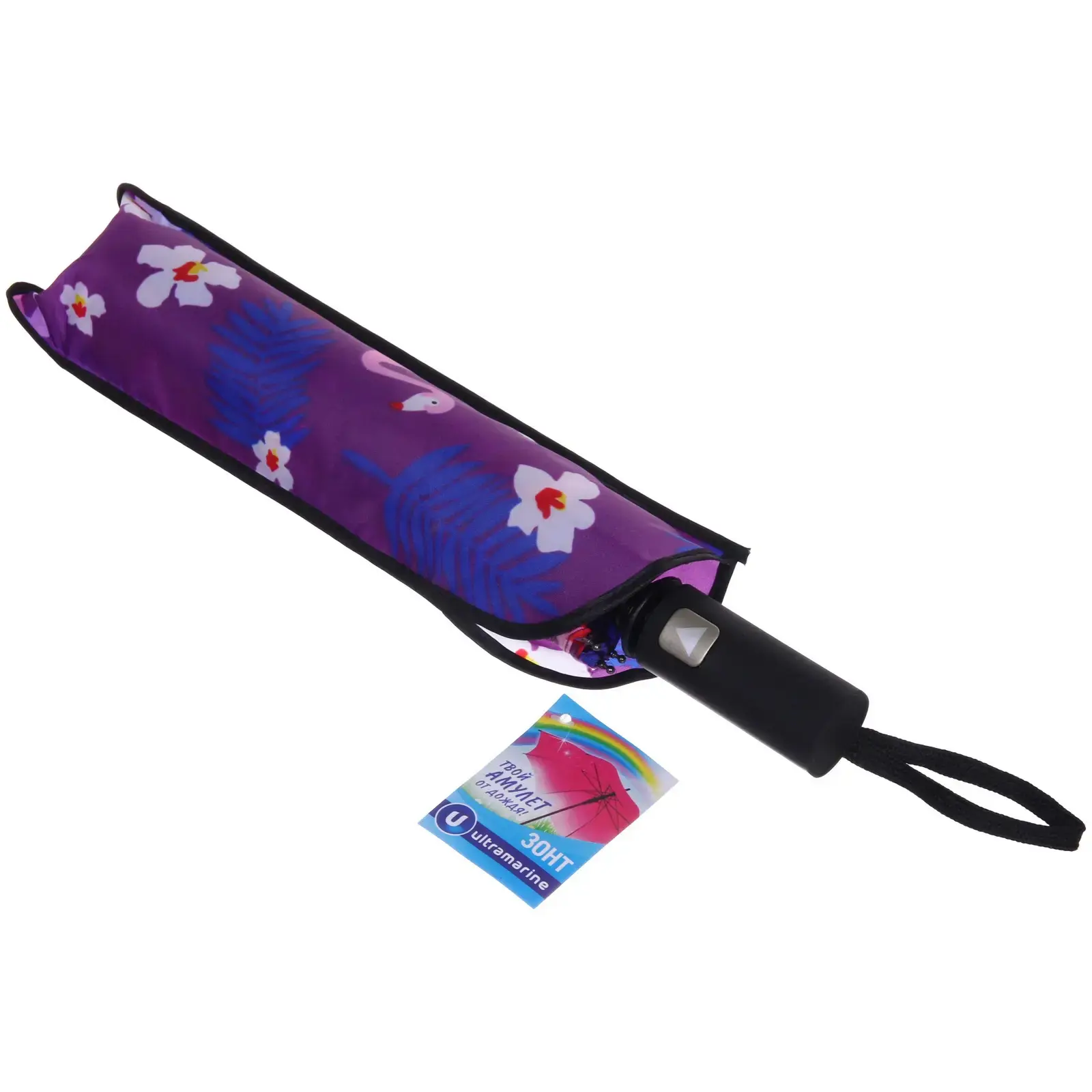 Зонт представлен в ассортименте из 6 ярких расцветок с тропическими мотивами: фламинго, экзотические цветы и листья на различных цветовых базах (розовый, фиолетовый, черный и другие). Цвет определяется случайным образом при отгрузке.